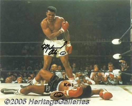 <B>Muhammad Ali Signed Photo</B></I> A color photograph measuring 10" x 8" depicting one of the most famous events in sports history -- Ali after he had just knocked out Sonny Liston on May 25, 1965. It was done in the first five minutes of the much touted rematch against Liston, whom he had defeated in Miami in 1964. Ali signs at center "Muhammad Ali" adding a smiley face. On Liston's chest "K.O. 1" with another smiley face. Boldly accomplished in black felt-tip marker. A great sports history display item! <I>Accompanied by COA from PSA/DNA.</B></I>