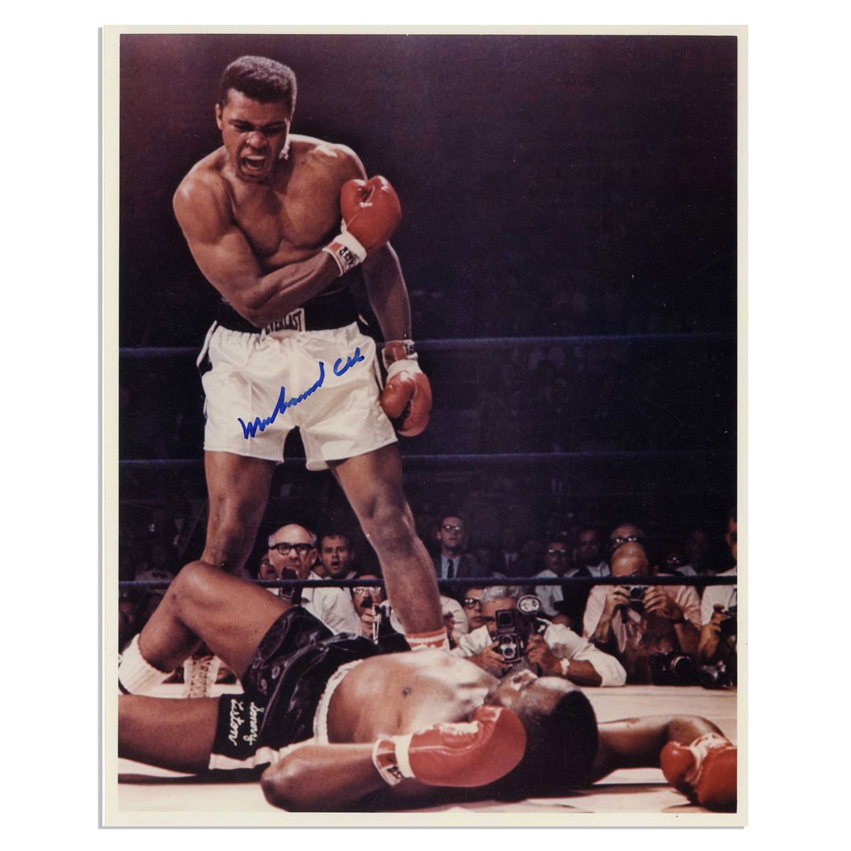 Muhammad Ali signed 8'' x 10'' photo as he famously stands over Sonny Liston and yells, ''Get up and fight, sucker!'' during the 1965 WBC heavyweight championship fight. Fine condition. With Wehrmann COA.