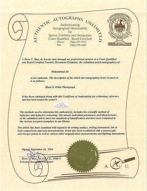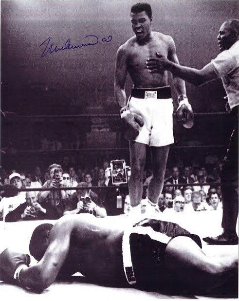 Muhammad Ali Signed Photograph AAU F21414 this is a black and white photograph of Ali standing over an opponent and measures 8 x 10 inches.