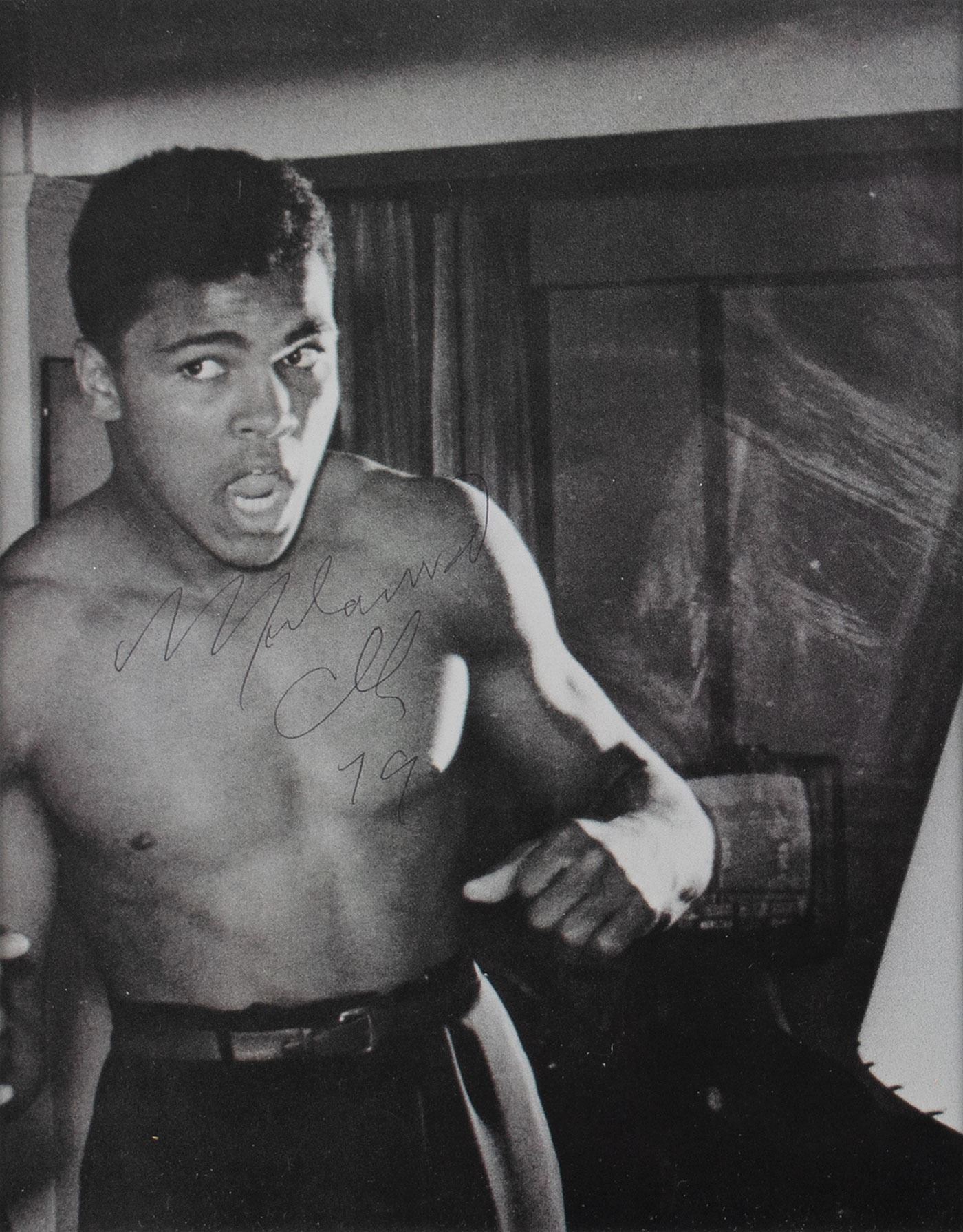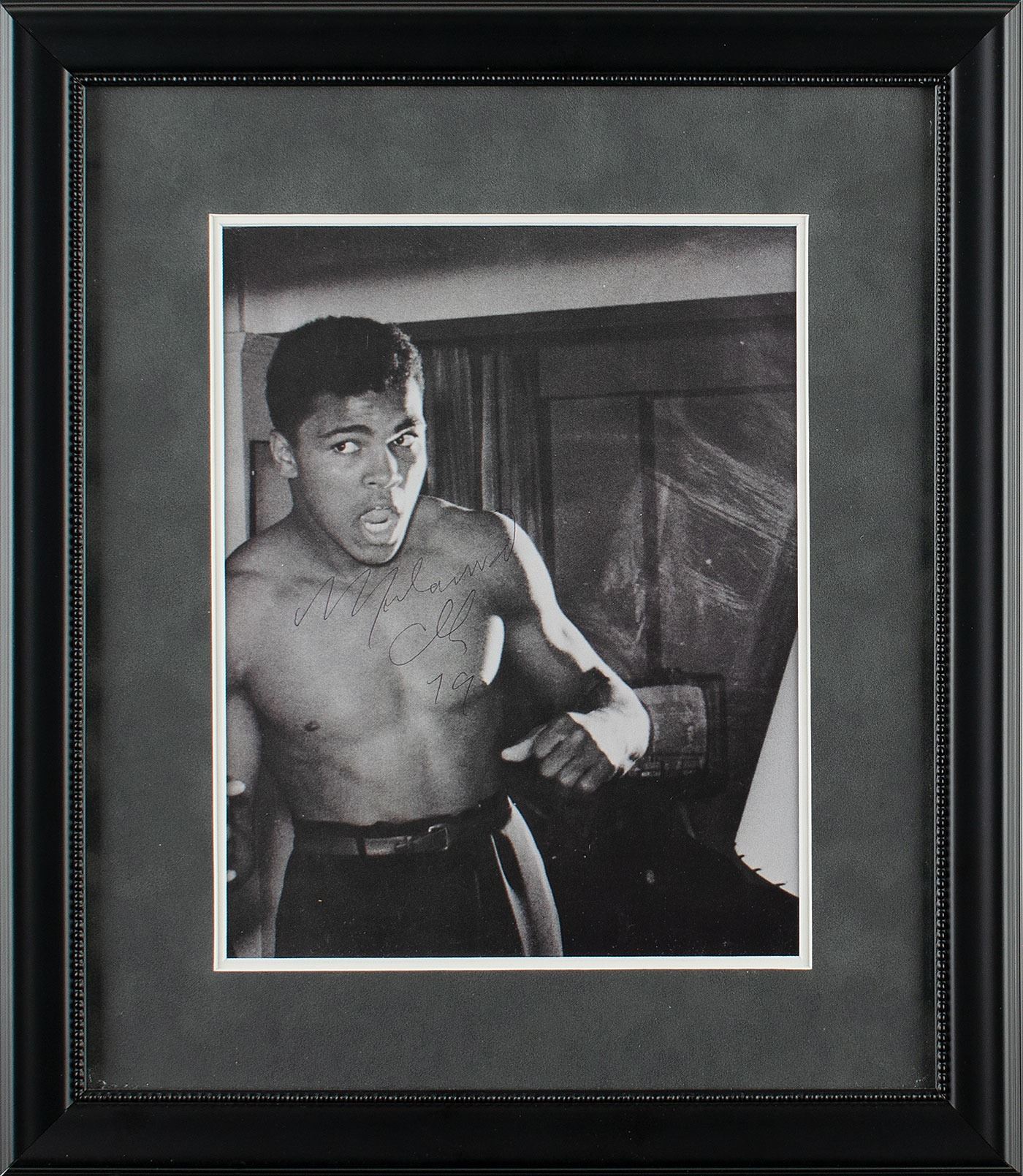Semi-glossy 7.5 x 9.5 photo of a shirtless Ali shadowboxing in his hotel room, signed in black ballpoint, "Muhammad Ali, 79." Double-matted and framed to an overall size of 13.5 x 15.5. In fine condition.