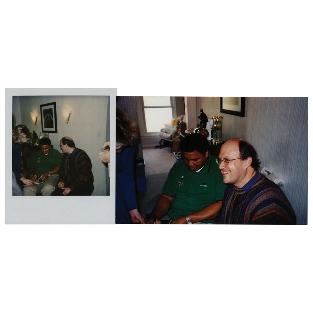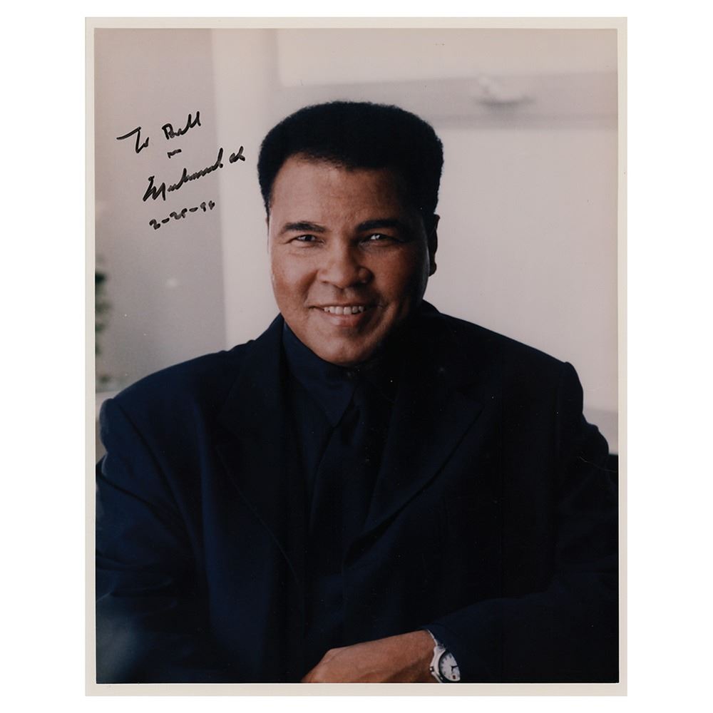 Color satin-finish 8 x 10 photo of 'The Greatest' wearing a dark suit and smiling into the camera, signed and inscribed in black felt tip to Chicago Sun-Times entertainment columnist Bill Zwecker, "To Bill, from, Muhammad Ali, 2-25-89.” In very good to fine condition, with several creases, one of which passes across Ali's eyes and nose. Accompanied by two photos of Ali taken at the time of signing.