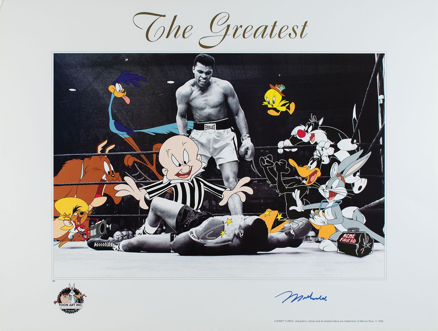 Color limited edition 24.5 x 18.5 publisher's proof print entitled 'The Greatest,' featuring the iconic image of Ali standing over Sonny Liston, surrounded by Looney Toons characters, marked "PP," signed in blue felt tip by Muhammad Ali. In fine condition, with a small crease to the upper left corner tip. Accompanied by a series of images taken at a private signing with Ali.
