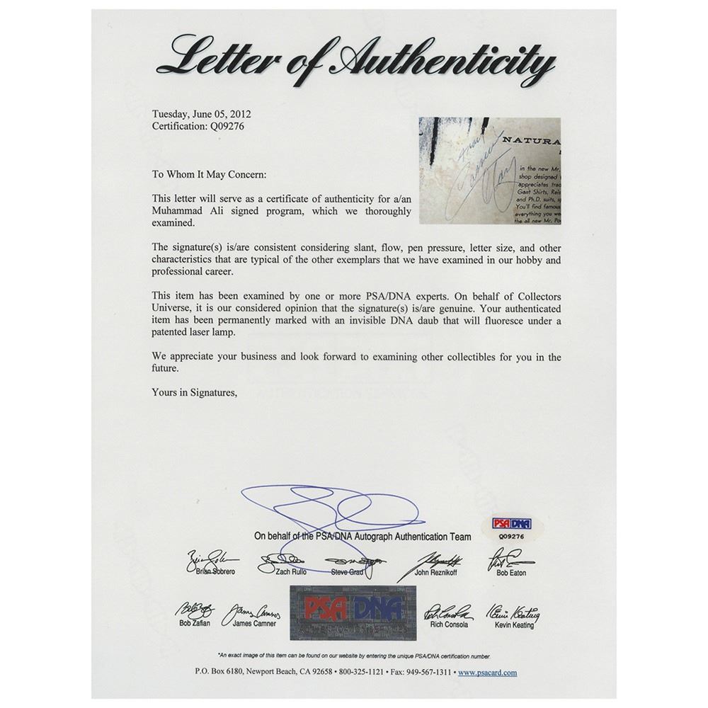 Program for the second annual Ohio Valley Jazz Festival in Cincinnati, August 23–25, 1963, 8.25 x 11, signed on the back cover in ballpoint, "From, Cassius Clay." In very good condition, with overall creasing and staining, not adversely affecting the signature itself. Accompanied by a full letter of authenticity from PSA/DNA and JSA. A highly sought-after, early example of Ali's early autograph.