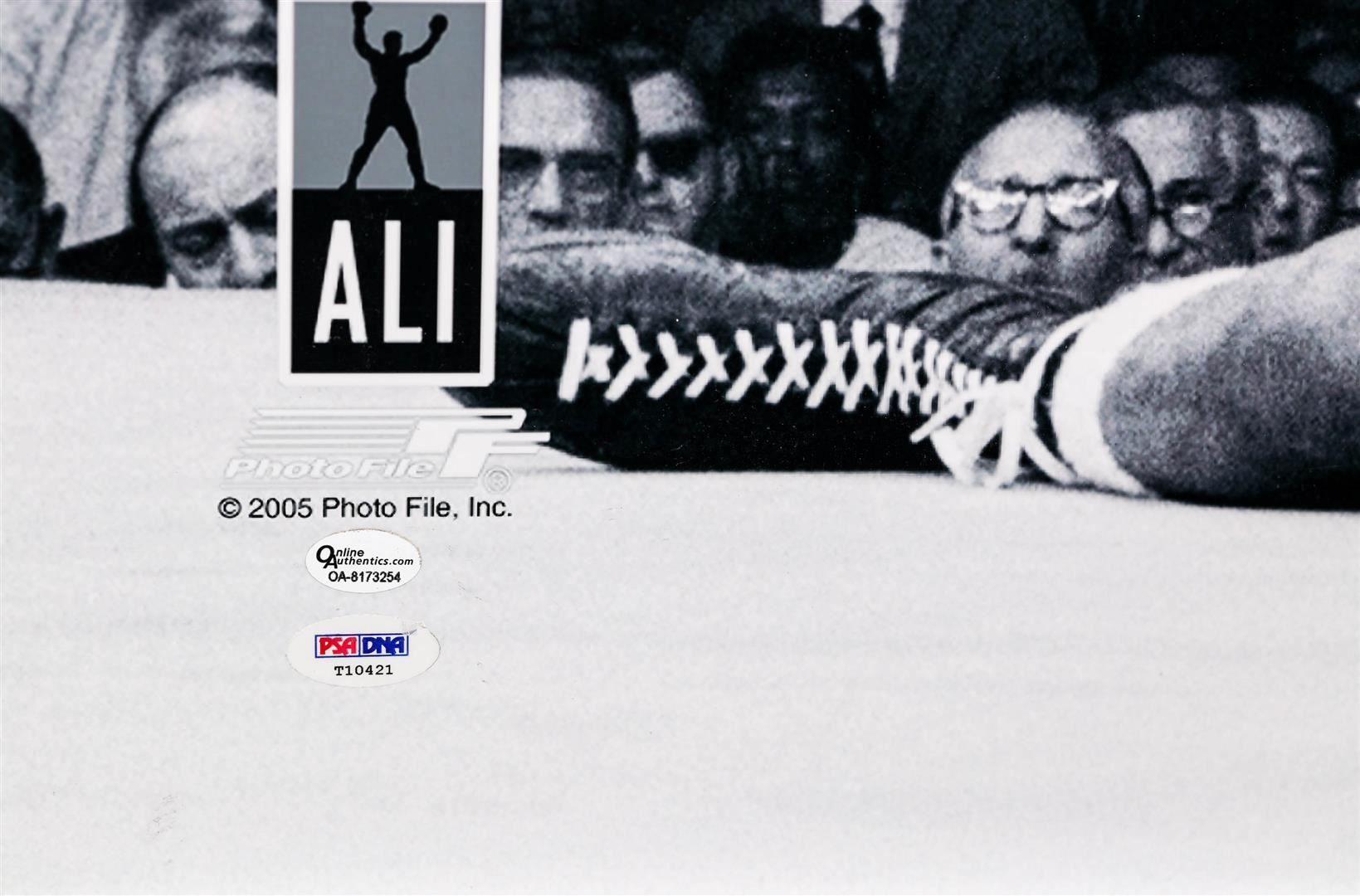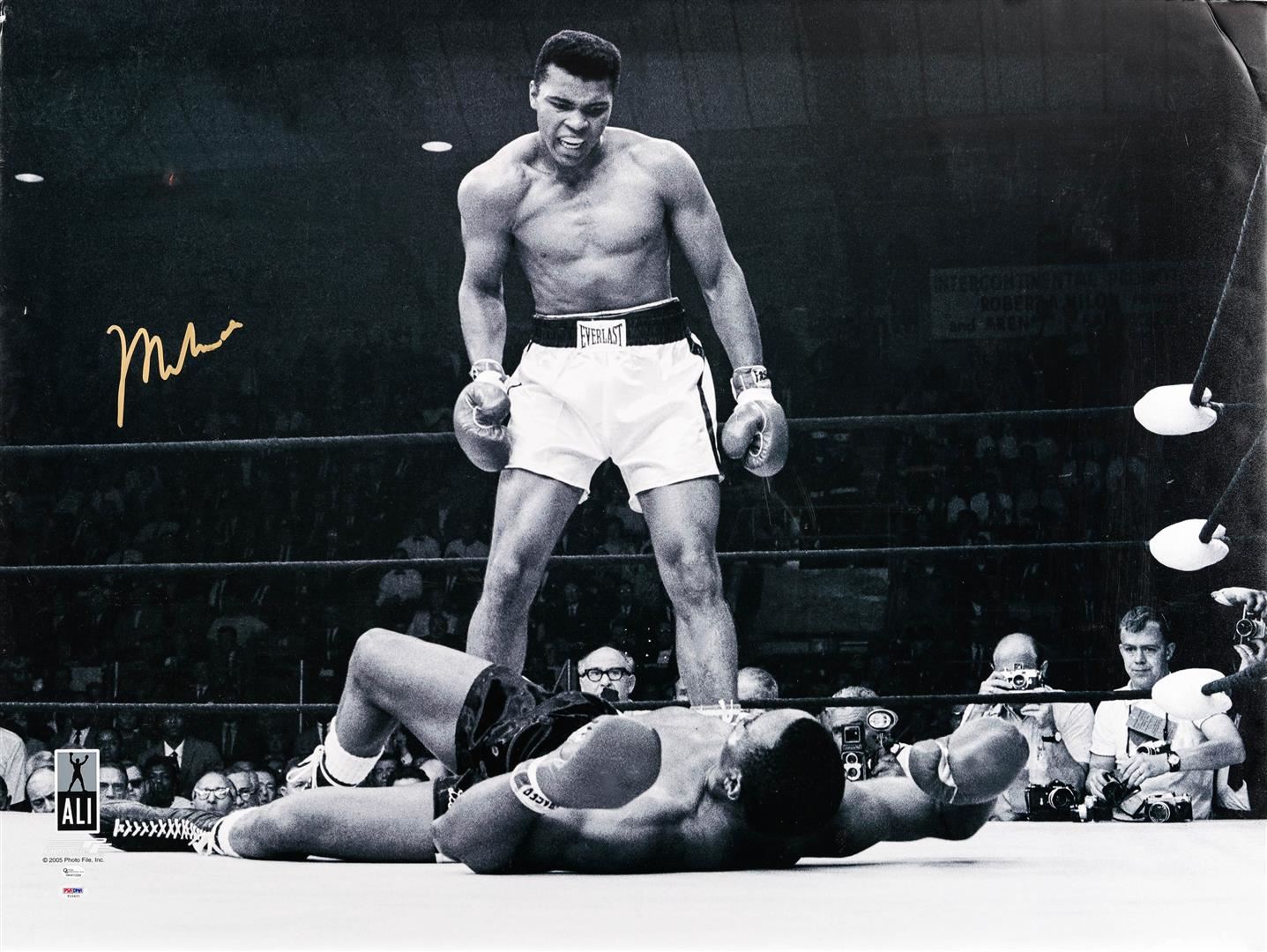 One autographed and PSA Certified black and white photo print featuring Muhammad Ali standing over Joe Frazier. Muhammad Ali passed away in June of 2016, leaving behind a legacy as the greatest of all time. Collectors have been demanding his memorabilia and the supply is getting smaller. Own a piece of boxing and sports history today with this autographed print with certification from PSA!