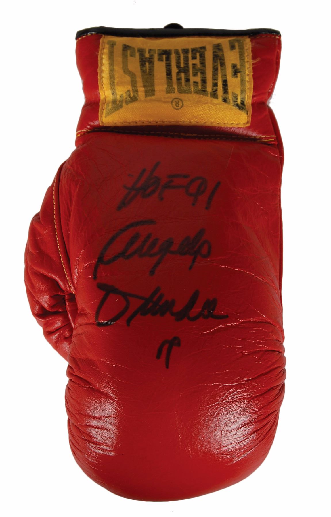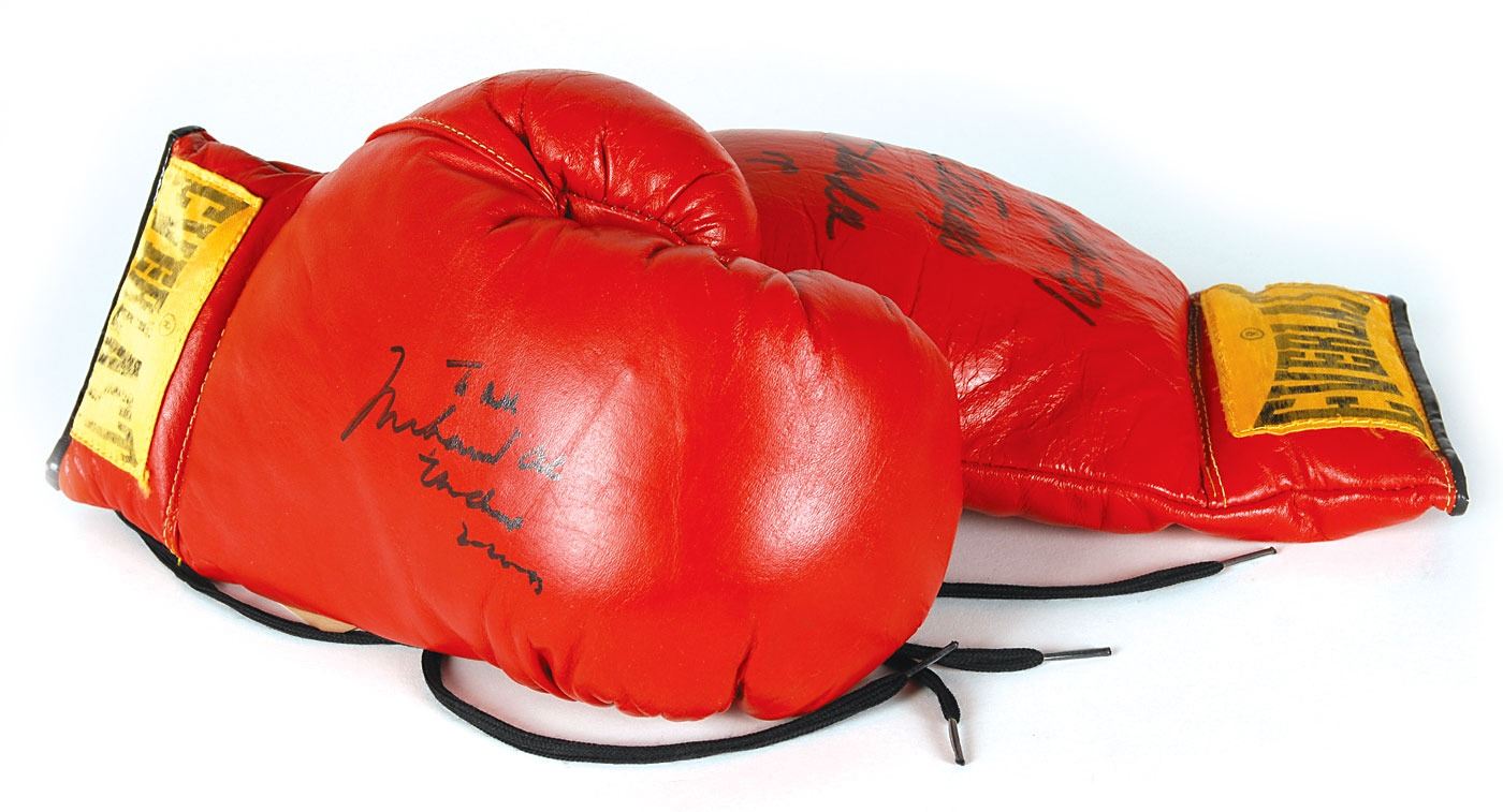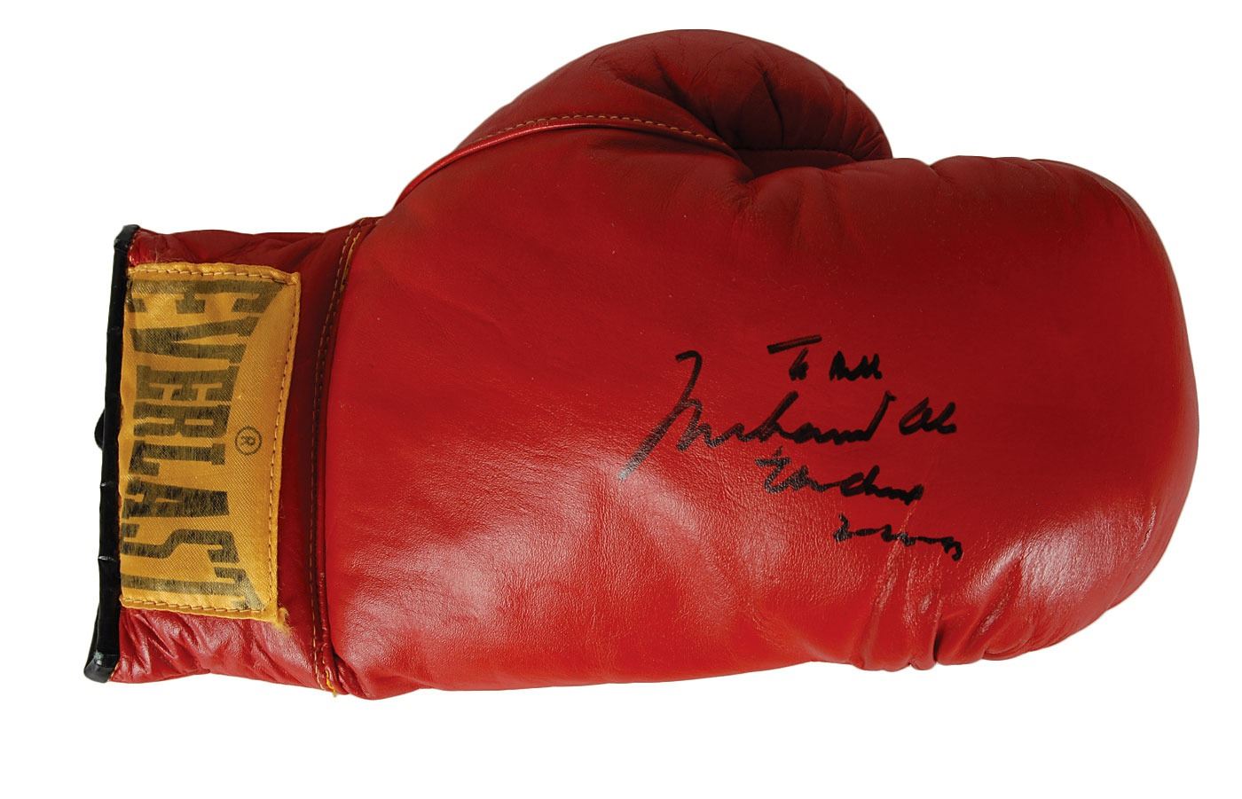 Pair of red Everlast boxing gloves, signed and inscribed on top of the right hand in black felt tip by Ali, "To Bill, Muhammad Ali, The Champ, 2-20-93," and signed on top of the left hand by Dundee, "HOF 91, Angelo Dundee." In overall fine condition, with general wear. Accompanied by the ticket stub from the Ali in-person autograph signing.