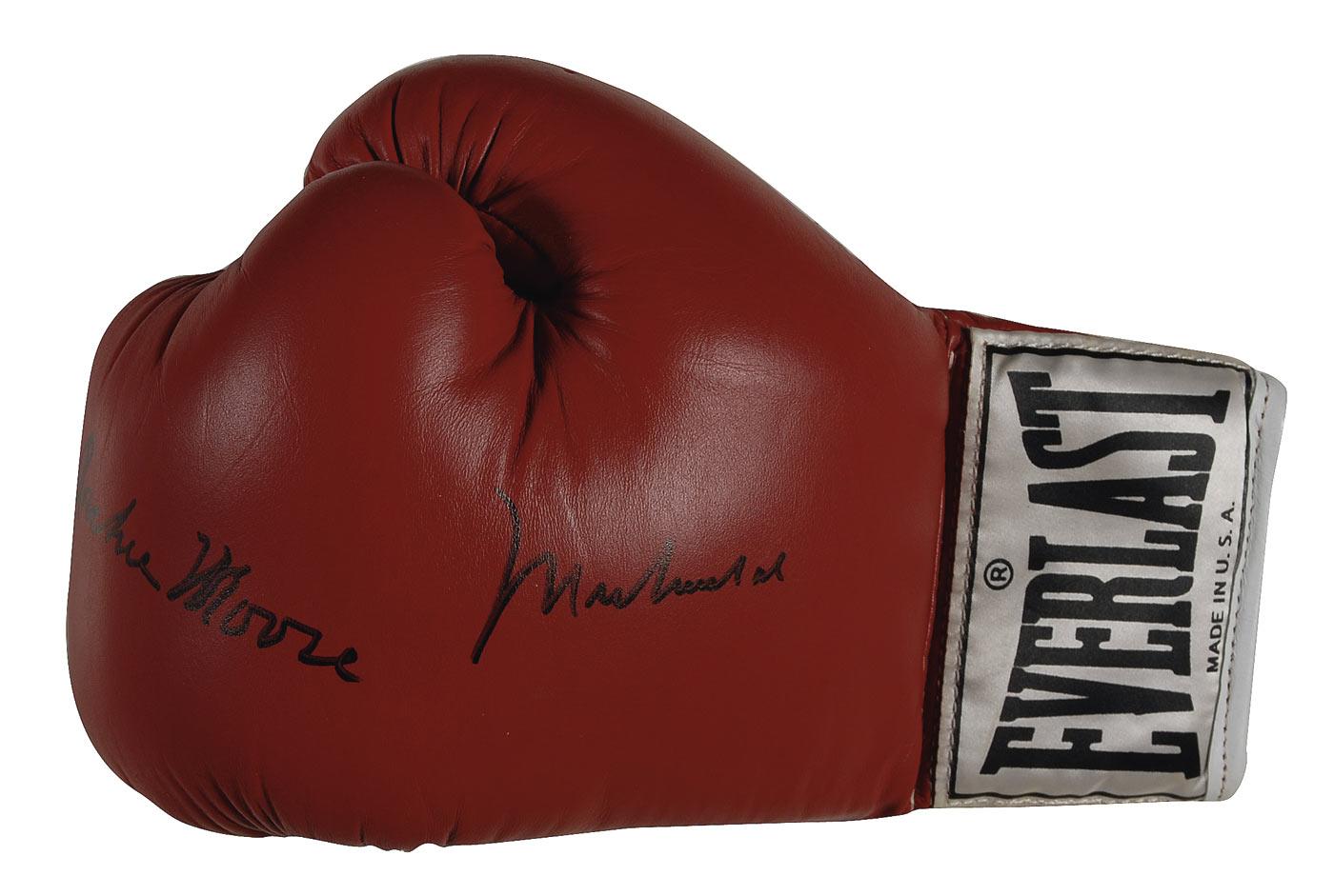Everlast left-handed boxing glove, labeled “2110,” on the palm, signed in black felt tip on the top by Muhammad Ali and Archie Moore. In very fine condition. Accompanied by a letter of authenticity from James Spence. Pre-certified Steve Grad/PSA/DNA and RRAuction COA.