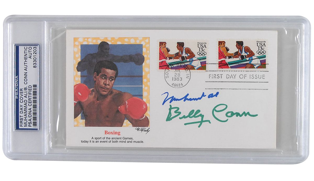 FDC with a cachet honoring boxing, signed in blue felt tip by Muhammad Ali and in green felt tip by Billy Conn. Encapsulated in a plastic PSA/DNA authentication holder. In very fine condition.