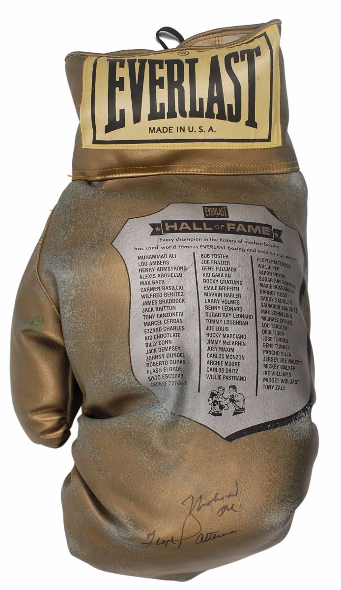 Giant-sized gold left-handed Everlast boxing glove, approximately 22.5 x 13.5, honoring 59 Hall of Fame boxing champions, signed in the lower portion in black felt tip by Muhammad Ali and Floyd Patterson. In fine condition, with a few spots of soiling and slight overall wear to the glove.