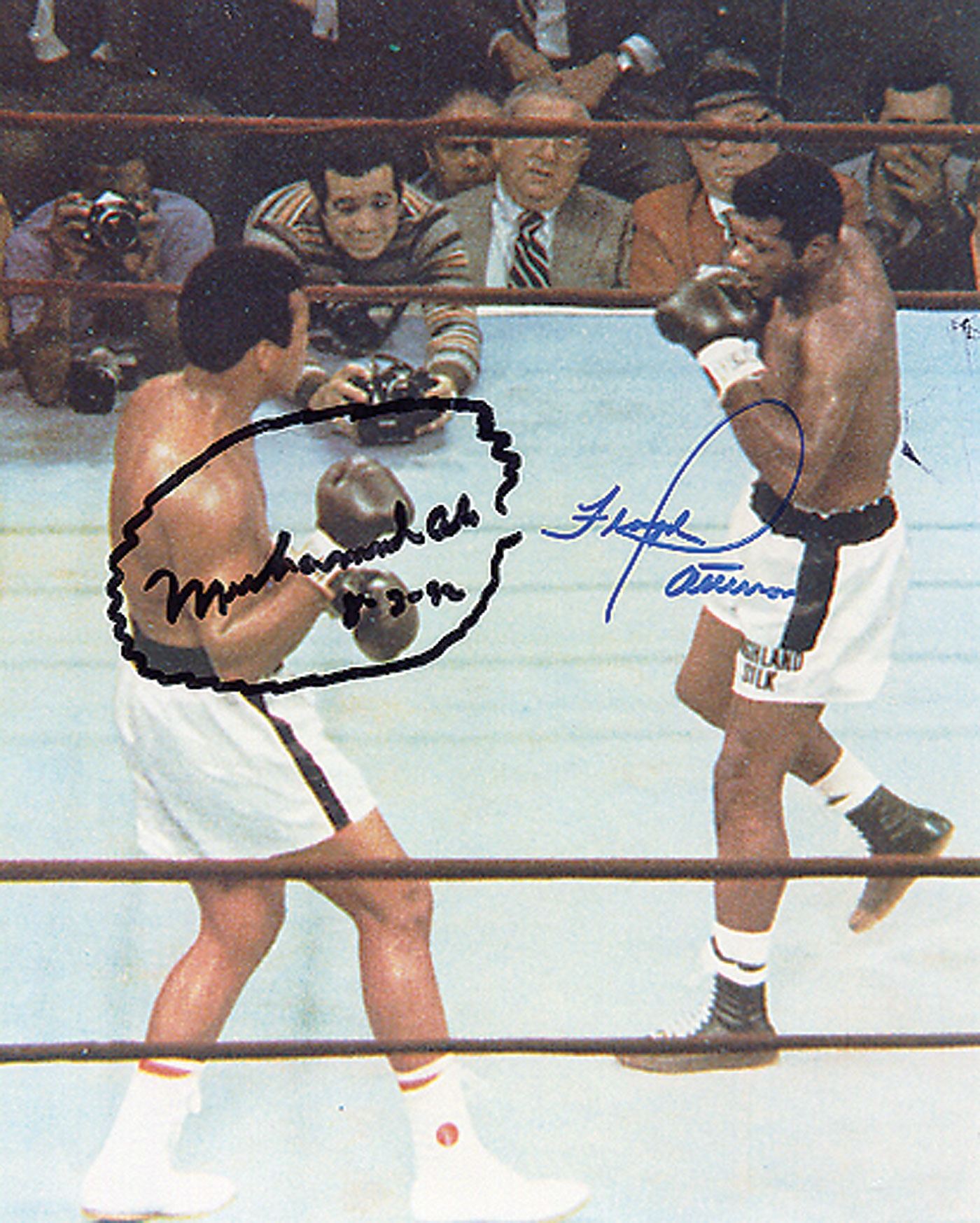 Color glossy 8 x 10 overhead photo of Ali and Patterson in the ring, signed within a hand-drawn ring in black felt tip, "Muhammad Ali, 8–3–92," and in blue felt tip, "Floyd Patterson." In fine condition, with somewhat grainy image quality.
