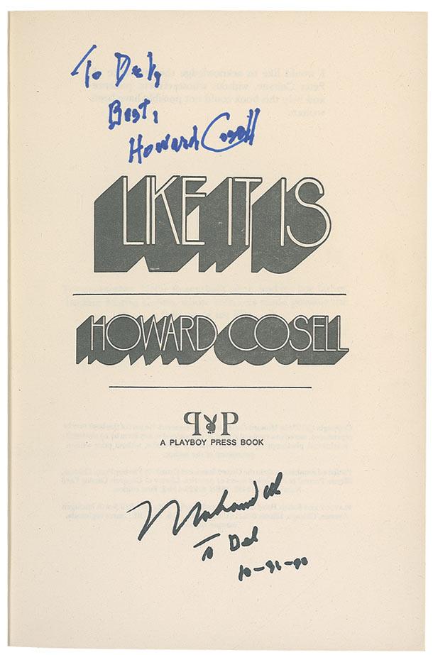 Signed book: Like It Is. First edition. Chicago: Playboy Press, 1974. Hardcover with dustjacket, 6.5 x 9.5, 305 pages. Signed and inscribed on the title page, “To Del, Best, Howard Cosell,” and “Muhammad Ali to Del 10-31-90.” Small ink mark to first free end page, scattered creasing and wear to dustjacket, which is also clipped inside, otherwise fine condition.