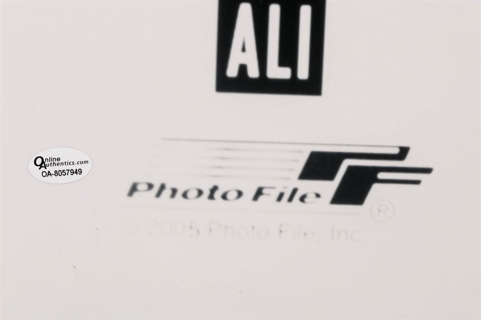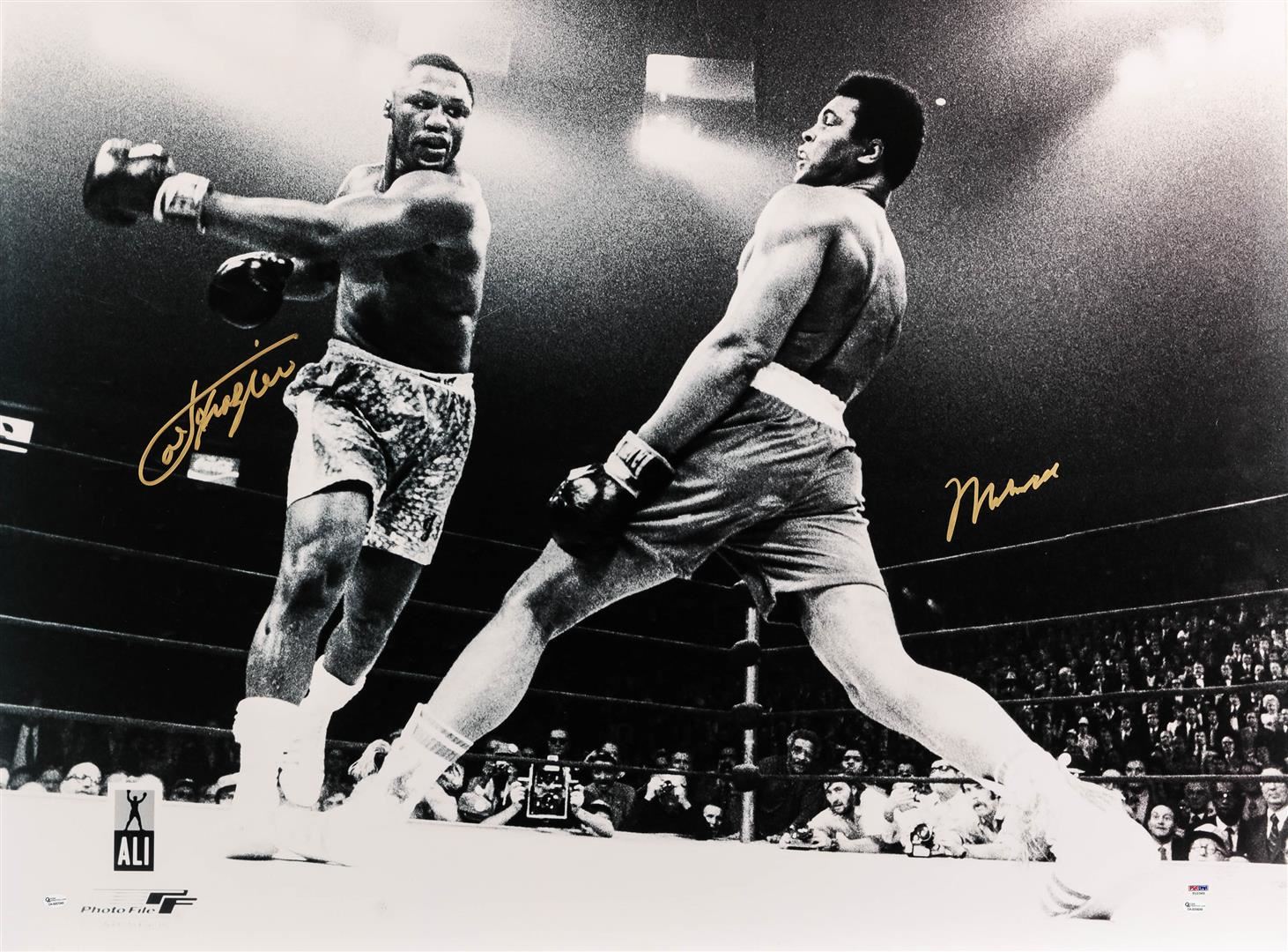 One autographed and PSA Certified black and white photo print featuring Muhammad Ali dodging a punch from Joe Frazier. Muhammad Ali passed away in June of 2016, leaving behind a legacy as the greatest of all time. Collectors have been demanding his memorabilia and the supply is getting smaller. Own a piece of boxing and sports history today with this autographed print with certification from PSA!