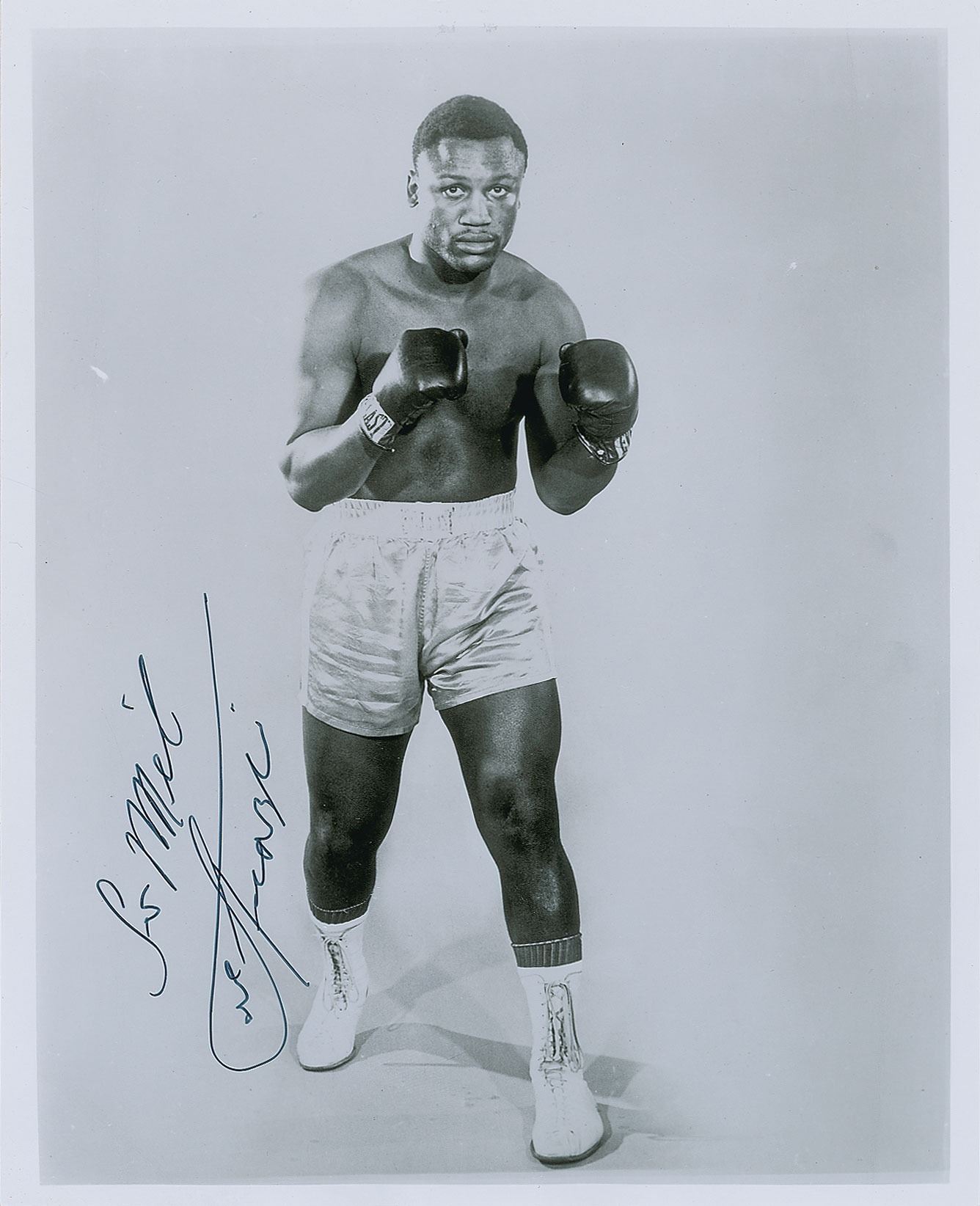 Two vintage glossy 8 x 10 full-length photos of the heavyweight champs in their Everlast gear, individually signed and inscribed in felt tip, "Muhammad Ali, 79" and "For Mil, Joe Frazier." Both bear "The Ring" ink stamps on the reverse, signifying that they originate from the archives of Ring Magazine. In overall fine condition.