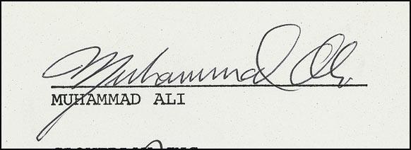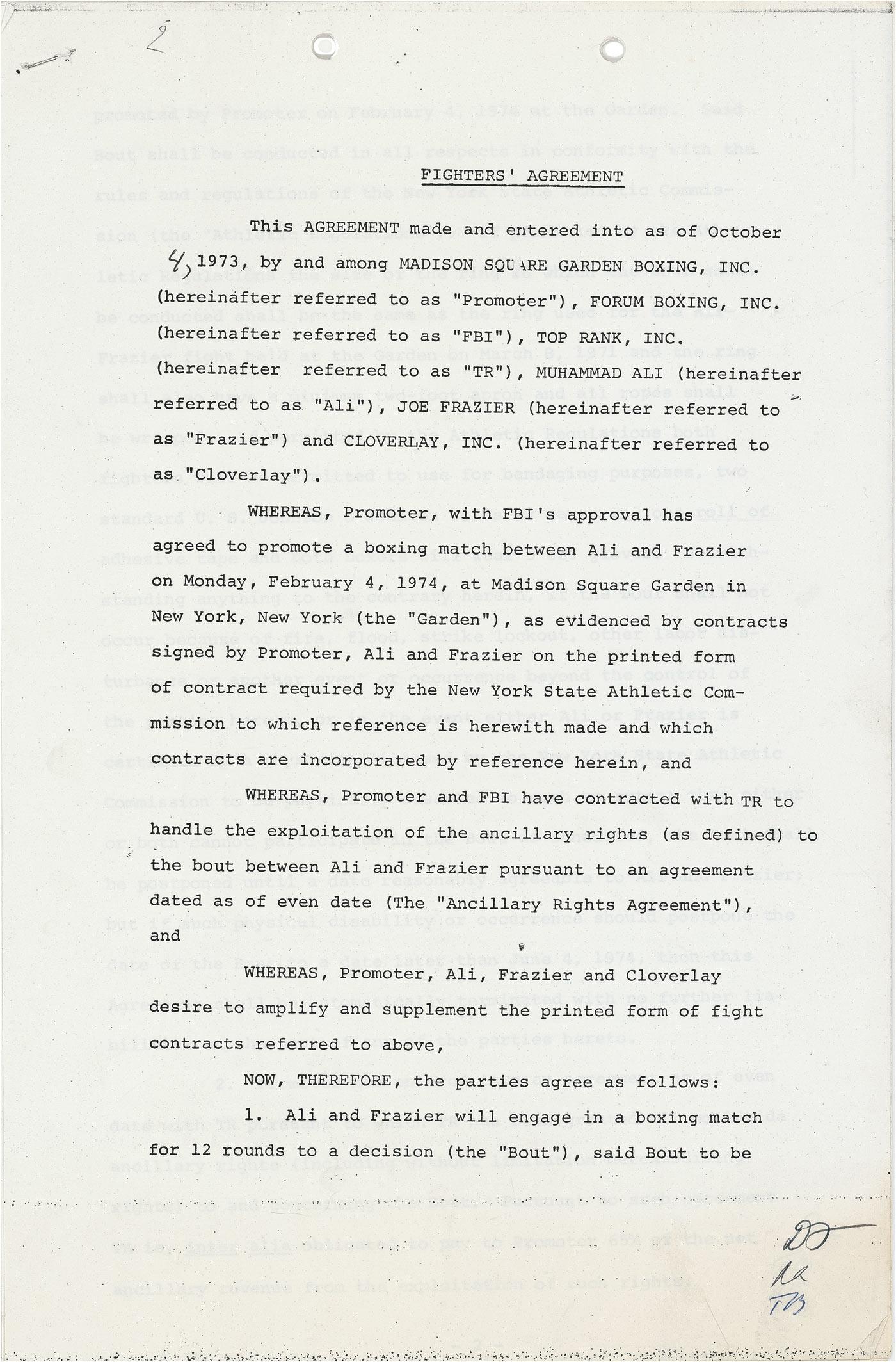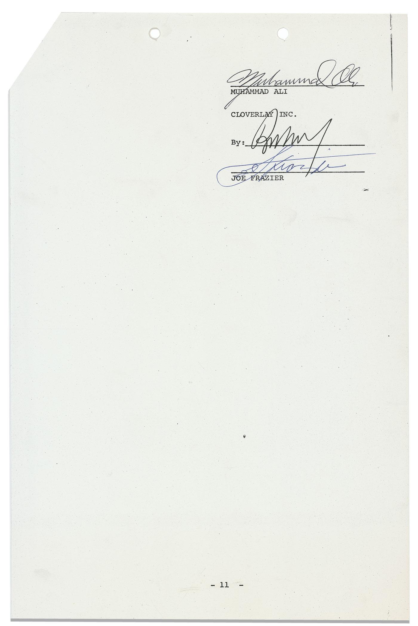 If on or before October 30, 1973, a determination is not received from the New York State tax authorities regarding the tax consequences to Ali, Cloverlay, and Frazier…FBI [Forum Boxing Inc.] may elect…to transfer the site of the bout to a location outside of New York…Ali and Cloverlay agree that The Spectrum in Philadelphia or The Astrodome in Houston, Texas, are approved alternative sites.” Signed on the last page in black ballpoint “Muhammad Ali,” and in blue ballpoint “Joe Frazier.” Document is also signed by several other officials. In fine condition, with two punch holes to top of each page, three sets of initials to bottom of each page, staple to top left, and some light toning to lower right corners of opening pages.