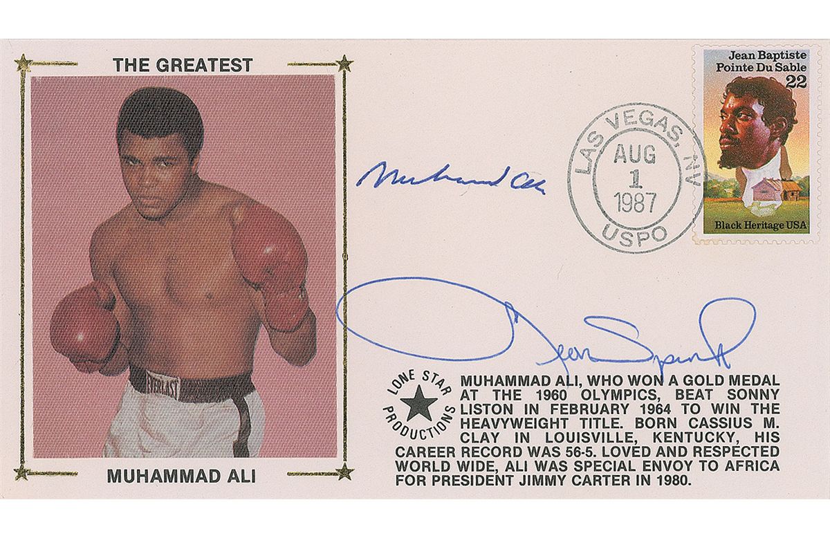 Commemorative cover with a color silk cachet honoring Muhammad Ali, signed in blue ink by Muhammad Ali and Leon Spinks. In very fine condition.