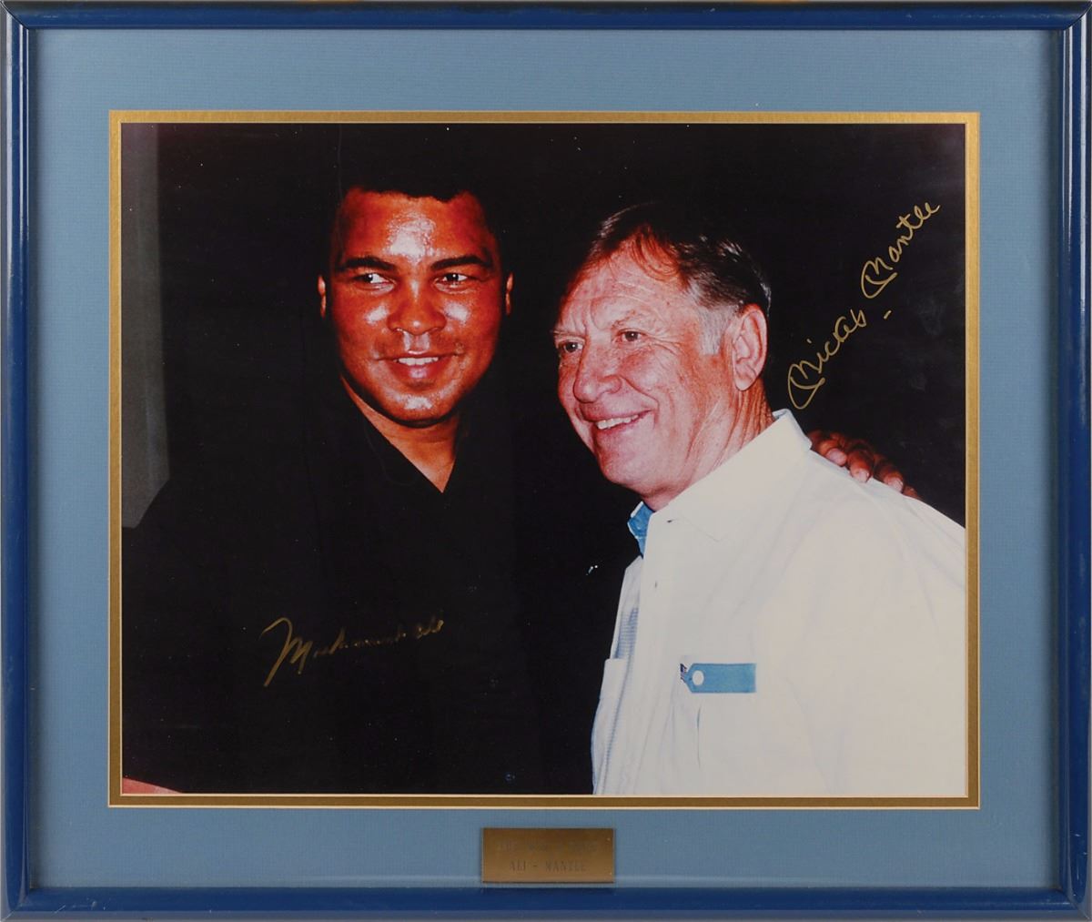 Desirable color glossy 19.5 x 15.5 photo of Muhammad Ali posing with Mickey Mantle, with both signing in gold ink. Double-matted and framed. In fine condition. This is the first example we have offered with them signing in matching gold ink.