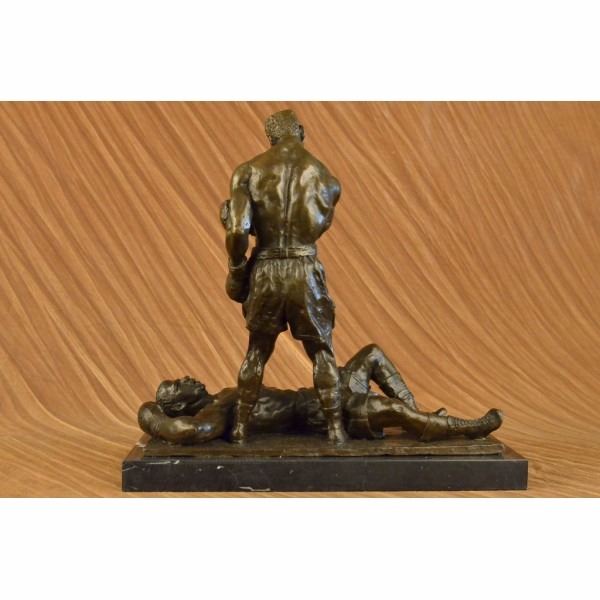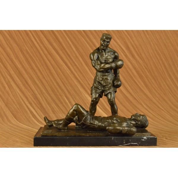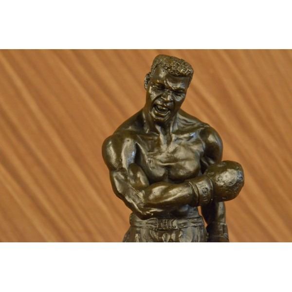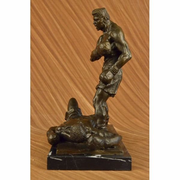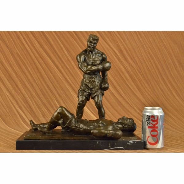 This is a bronze sculpture of Muhammad Ali and Sonny Liston second round fight. Original piece featuring the historic boxing event between the legendary fighters. The ending of the second fight remains one of the most controversial in boxing history, a unforgettable moment for true boxing fans. Midway through the first round, Liston fell to the canvas, in what many have argued was not a legitimate knockdown. Ali stood over his fallen opponent, gesturing and yelling at him, get up and fight. The moment was captured by ringside photographer Neil Leifer, and has become one of the most iconic images in sports. Bronze dimensions with marble base: Height 15 X Width 15 inches. Weight: 25 lbs. Please Note: This is a reproduction bronze sculpture from the original molded and signed. This featured bronze sculpture is a recast after the original, and has been done recently. This 100% bronze sculpture is an abstract piece certain to be a conversation piece.