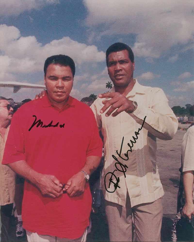 Color glossy 8 x 10 photo of Ali and Stevenson posing together at an airport, signed in black felt tip by Muhammad Ali and Teofilo Stevenson. In fine condition.