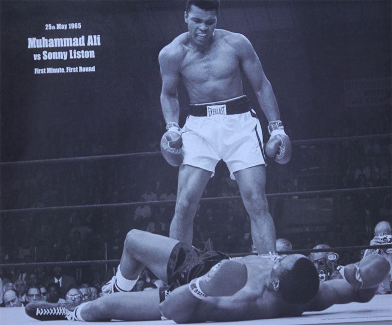 Muhammad Ali black and white classic qoute **|**|** UNFRAMED; This black and white poster is an image from Muhammad Ali and Sonny Liston's second fight. Ali is Standing over Liston's body in a boxing ring with an audience and photographers pictured behind them. In the upper left corner reads First Round, First minute MUHAMMAD ALI VS SONNY LISTON 25th MAY 1965. Muhammad Ali (born Cassius Marcellus Clay Jr. January 17, 1942) is a retired American boxer and three-time World Heavyweight Champion, who is widely considered one of the greatest heavyweight championship boxers of all time. After fighting Sonny Liston in 1964 a rematch was ordered. The ending of the second fight (May 25th 1965) remains one of the most controversial in boxing history. Midway through the first round, Liston fell to the canvas, in what many have argued was not a legitimate knockdown. Ali refused to retreat to a neutral corner. Instead, Ali stood over his fallen opponent, gesturing and yelling at him, "Get up and fight, sucker!" which is when this famous photograph was taken. ; MSRP: $150