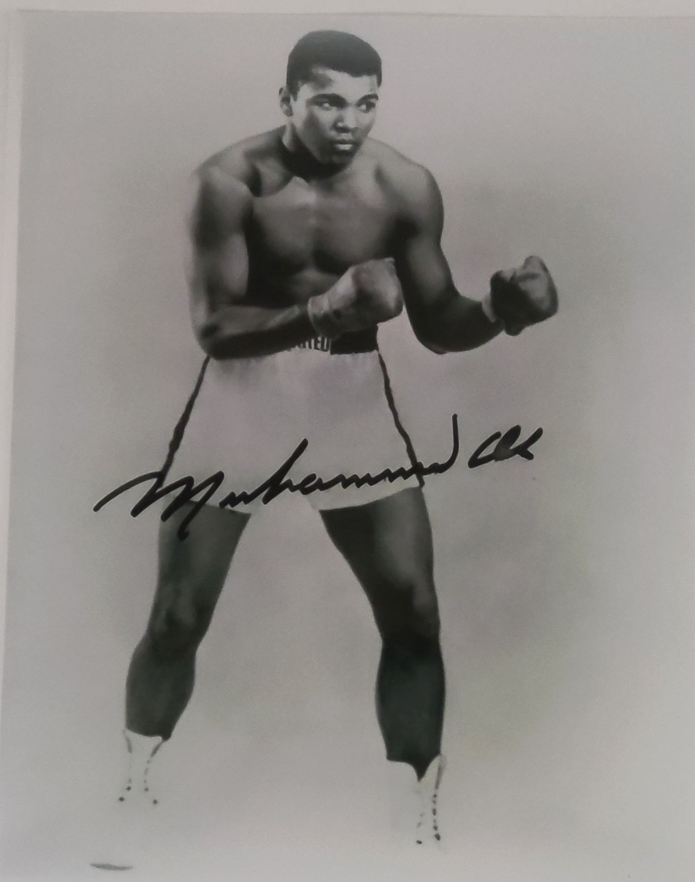 A black and white glossy photo of Ali, signed in black sharpie by Muhammad Ali. 10x8 inches. Mounted to board and framed. Supplied with coa.