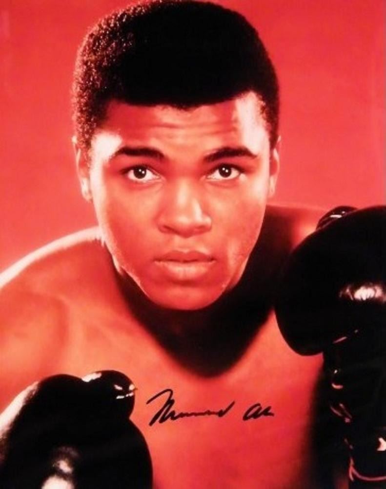 Portrait photo autographed by Muhammad Ali. 8x10 inches. This item is a reprint of an original autograph