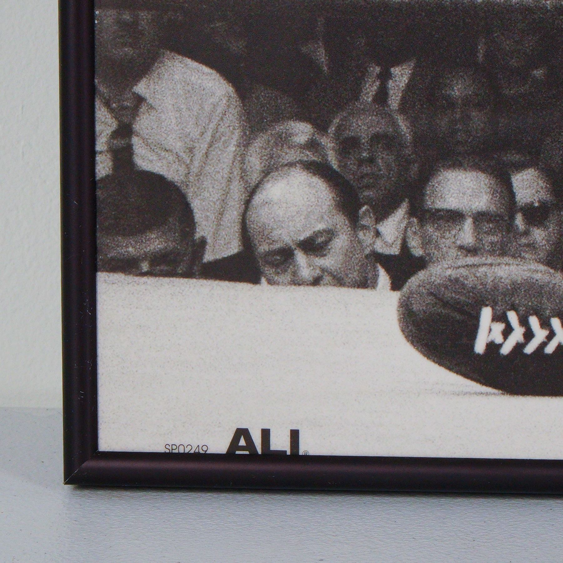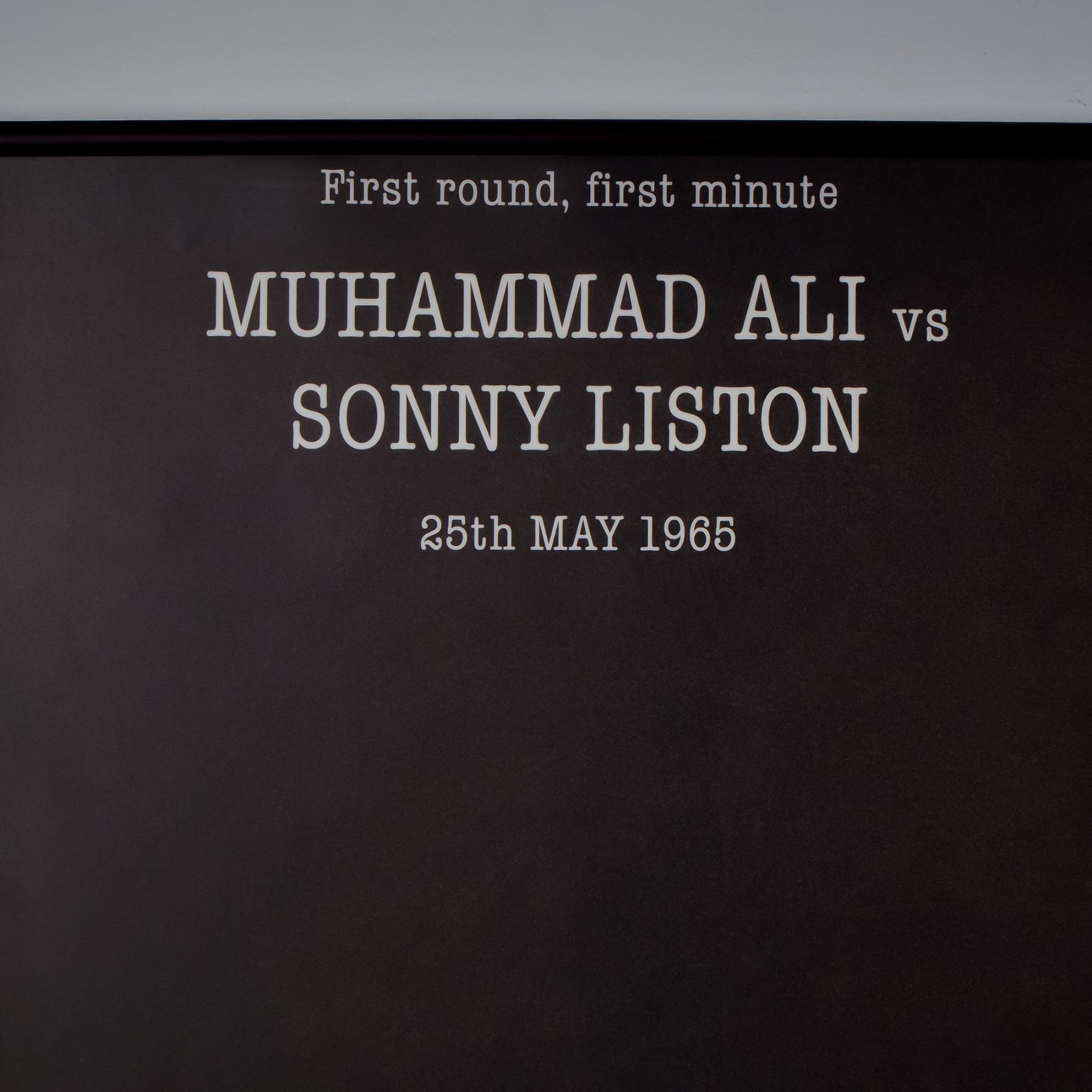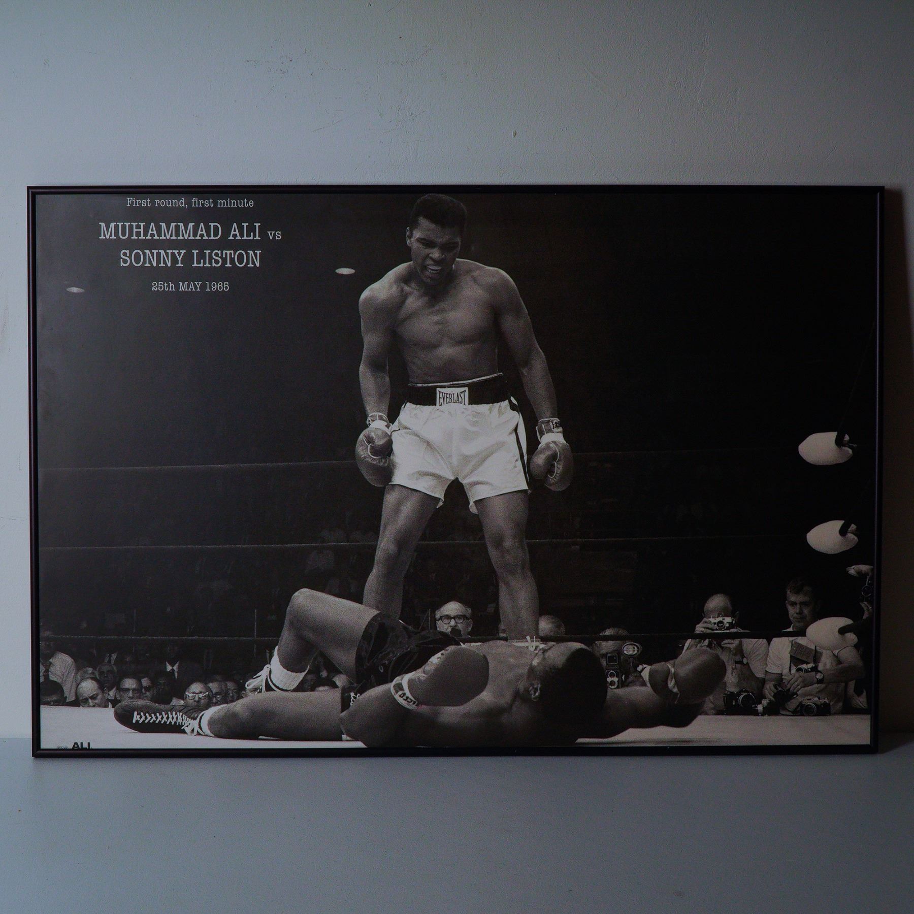 An electrifying framed photo poster mounted on board, capturing one of the most famous moments in sports history, Muhammad Ali standing triumphantly over Sonny Liston after the first-round knockout on May 25, 1965. Known as the Phantom Punch, this fight remains one of the most debated and celebrated events in boxing. The black-and-white image is a bold, dramatic composition: Ali towering in his Everlast trunks, exuding defiance and dominance, with Liston sprawled on the canvas. Above the image, the text reads First round, first minute Muhammad Ali vs Sonny Liston 25th May 1965, cementing the historic context. Mounted on board and housed in a simple black frame with hanging wire, this piece is ready to display. Marked in the corner with ALI SP0249.