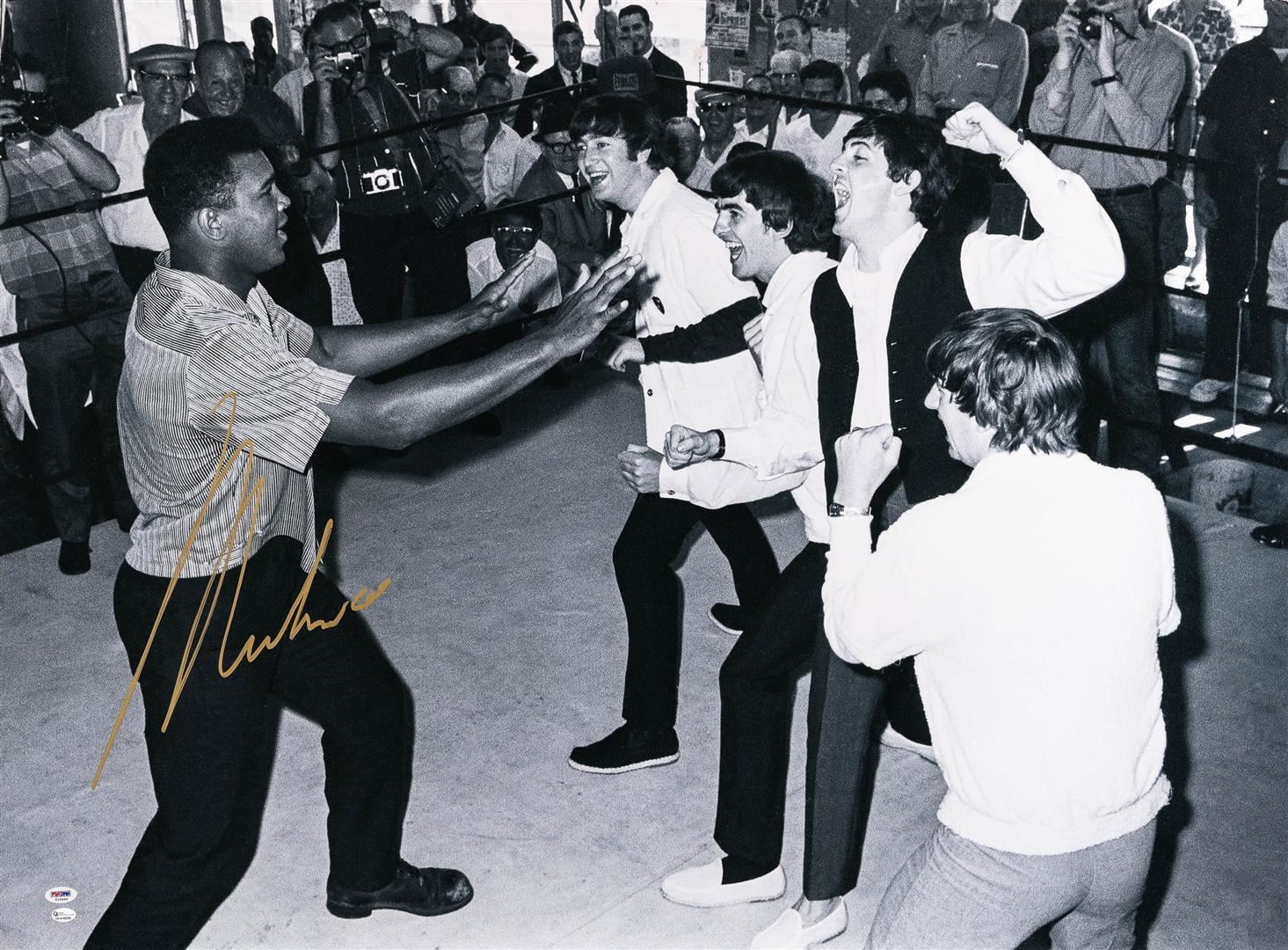 One autographed and PSA Certified black and white photo print featuring Muhammad Ali and The Beatles. Muhammad Ali passed away in June of 2016, leaving behind a legacy as the greatest of all time. Collectors have been demanding his memorabilia and the supply is getting smaller. Own a piece of boxing and sports history today with this autographed print with certification from PSA!