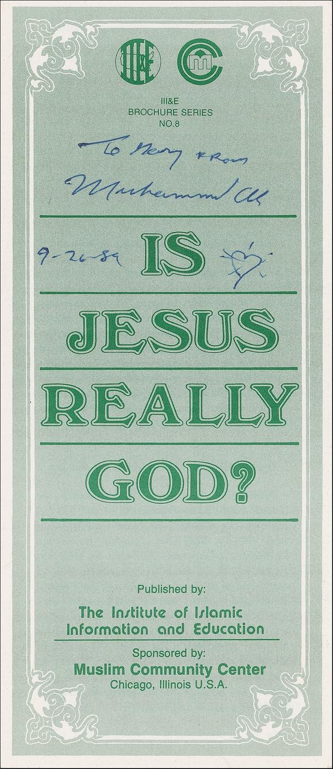 Tri-fold religious pamphlet, 3.75 x 8.5, entitled “Is Jesus Really God?,” signed and inscribed on the front in blue ballpoint, “To Mary from Muhammad Ali, 9-26-89,” adding a small sketch of a heart. In very fine condition.