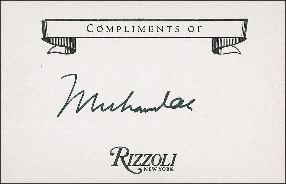 Signed Rizzoli, New York, bookplate, 4 x 2.5, signed in black felt tip by Ali. In very fine condition. The bookplate is for the accompanying hardcover edition of Muhammad Ali Memories and was signed for author Thomas Hauser. Accompanied by a Letter of Authenticity from Hauser.