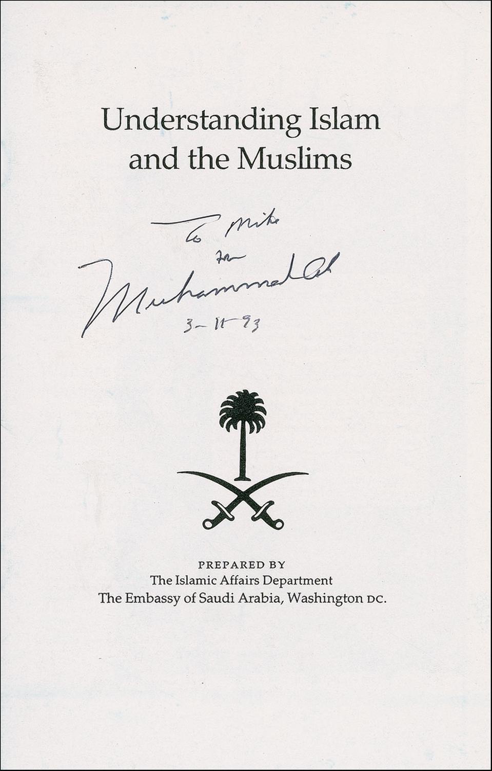 Booklet entitled ‘Understanding Islam and the Muslims,’ 1989, 5.25 x 8.25, signed and inscribed on the title page, “To Mike from Muhammad Ali 3-11-93.” In fine condition.