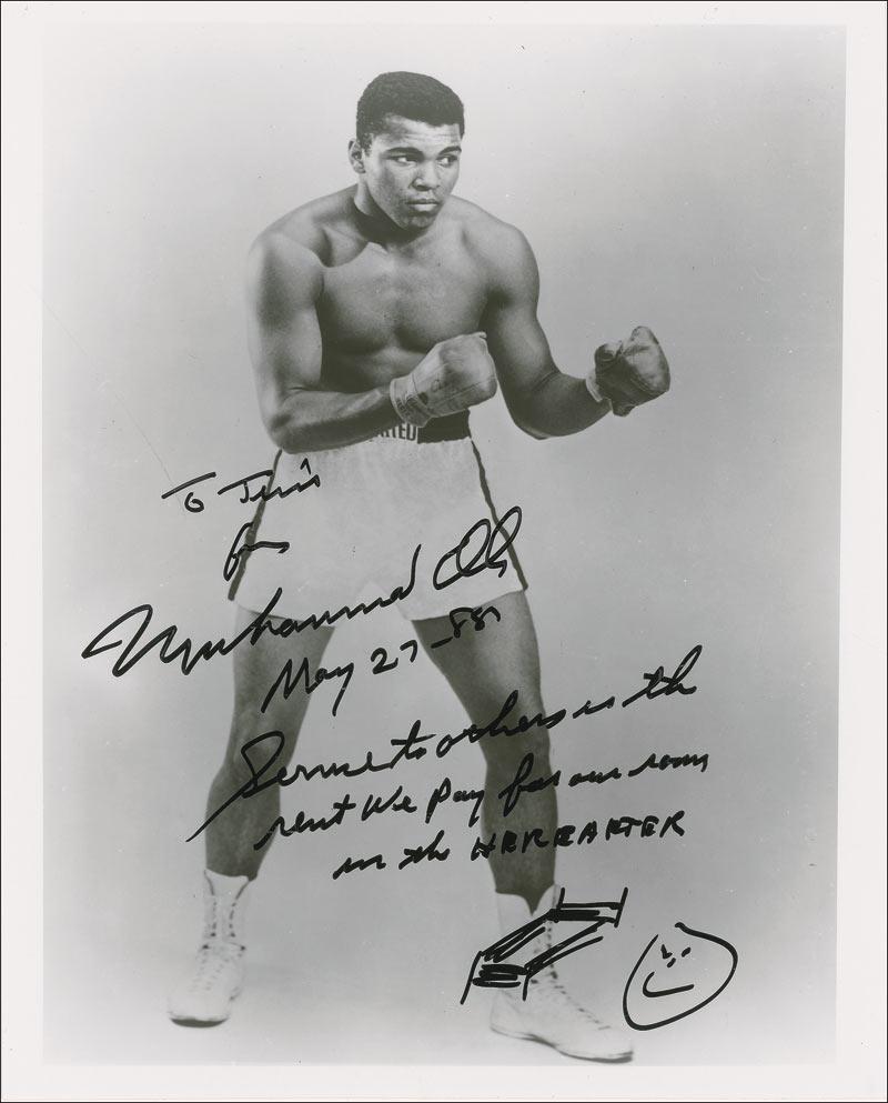 Glossy 8 x 10 photo of Ali striking a boxing pose, signed and inscribed in black felt tip “To Jim from Muhammad Ali, May 27—88. Service to others is the rent we pay for our room in the hereafter.” Ali has added a sketch of a boxing ring and a ‘smiley’ face. In fine condition.