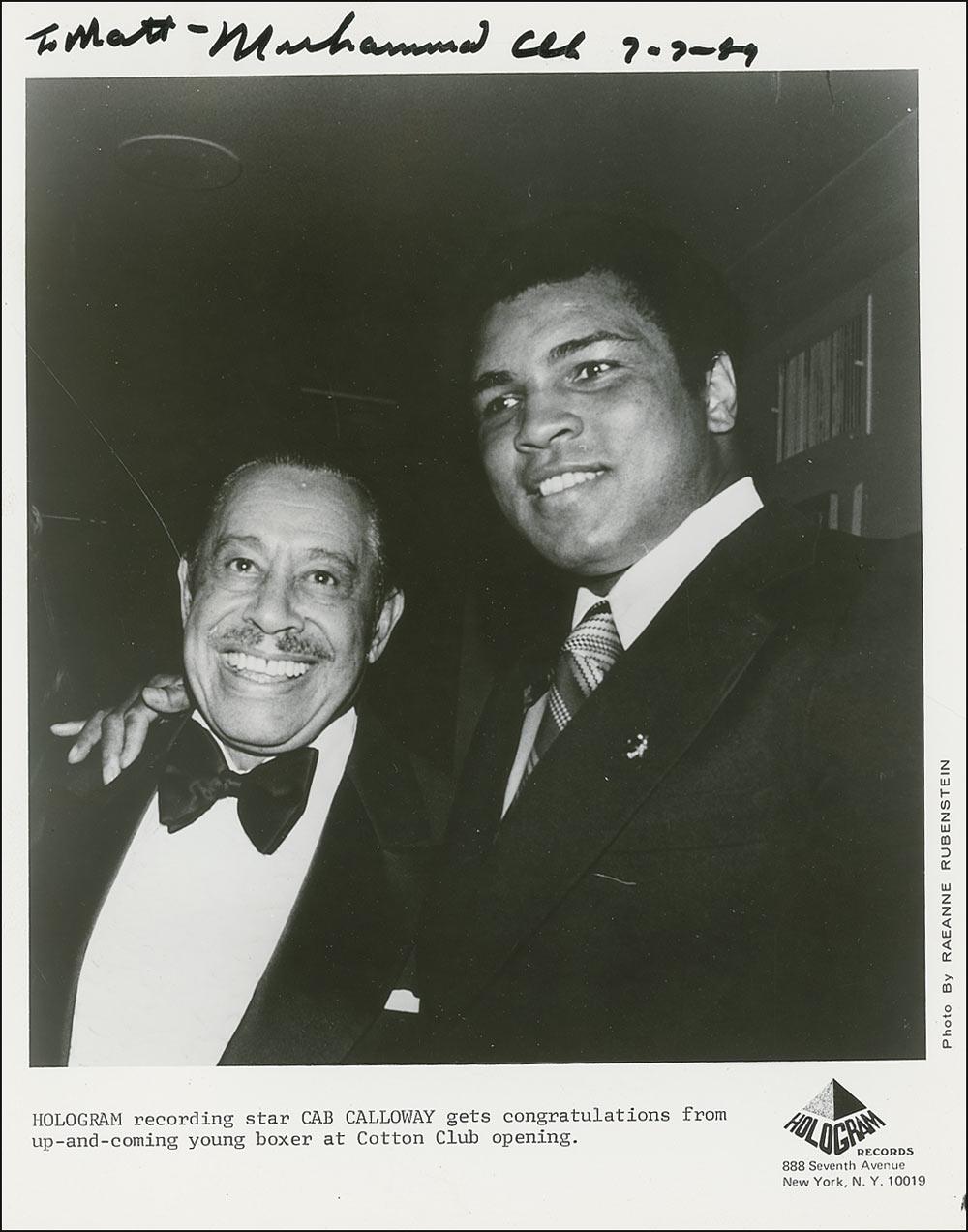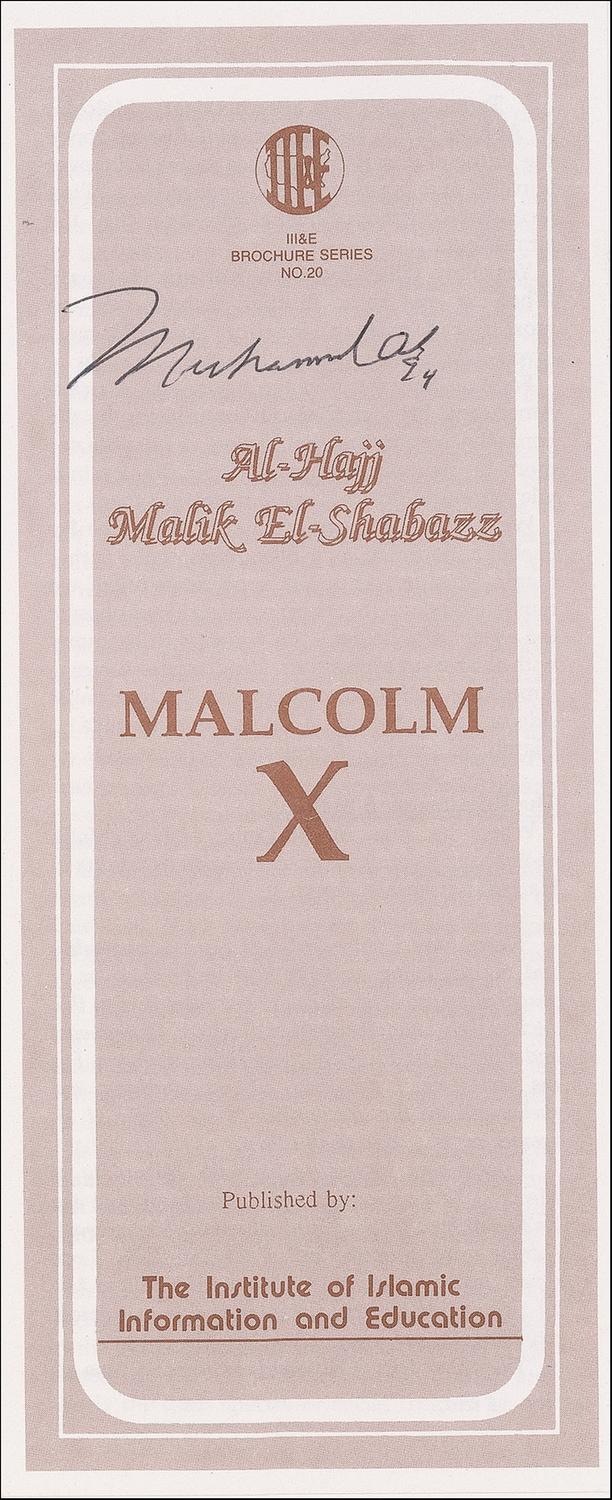 Two items: glossy 8 x 10 Hologram Records publicity photo of Ali and Cab Calloway, signed and inscribed in the top border in black felt tip, “To Matt–Muhammad Ali 7-7-89”; and a religious pamphlet, 3.5 x 8.5, entitled ‘Malcolm X,” signed on the front in black ballpoint. In fine condition, with some scattered light surface marks and creases to photo.