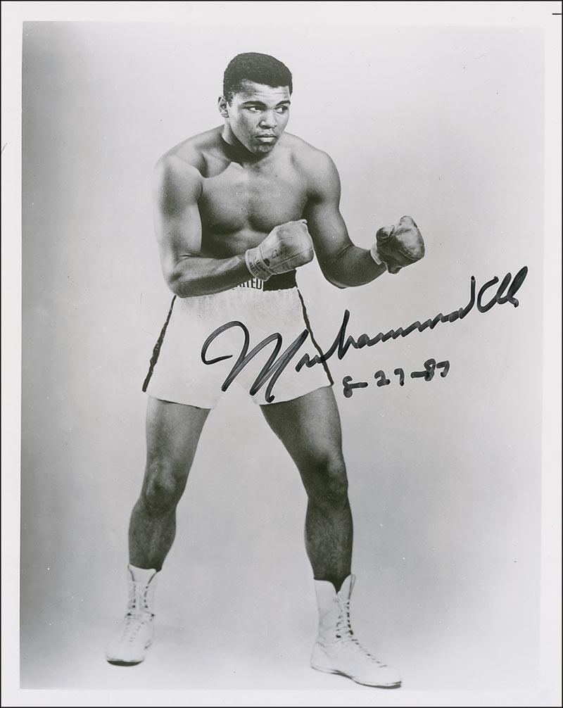 Glossy 8 x 10 publicity photo of the champ, signed in black felt tip “Muhammad Ali 8–27–87.” In fine condition. Ali’s large signature measures five inches in length!