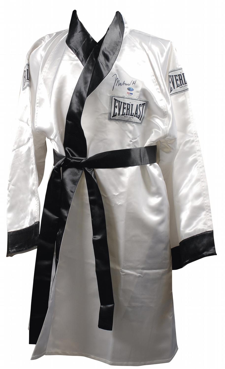 White silk Everlast boxing robe signed in black felt tip on the front. In very fine condition with a PSA/DNA authentication label affixed under signature. Accompanied by a full letter of authenticity from PSA/DNA.