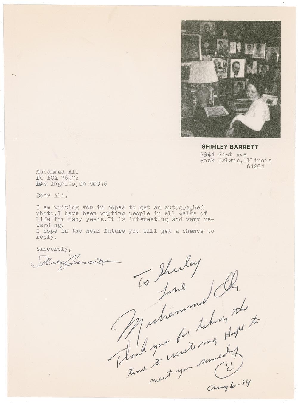 ANS, one page, 8 x 11, August 6, 1984. Short note written at the bottom of a collector’s TLS to Ali. Ali writes: “To Shirley, Love, Muhammad Ali. Thank you for taking the time to write me, Hope to meet you someday.” After his note, Ali adds a small happy face sketch. In fine condition. Accompanied by the original mailing envelope addressed in Ali’s hand.