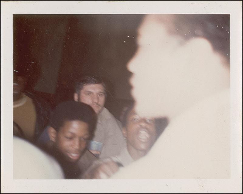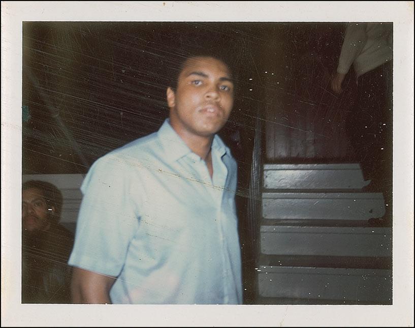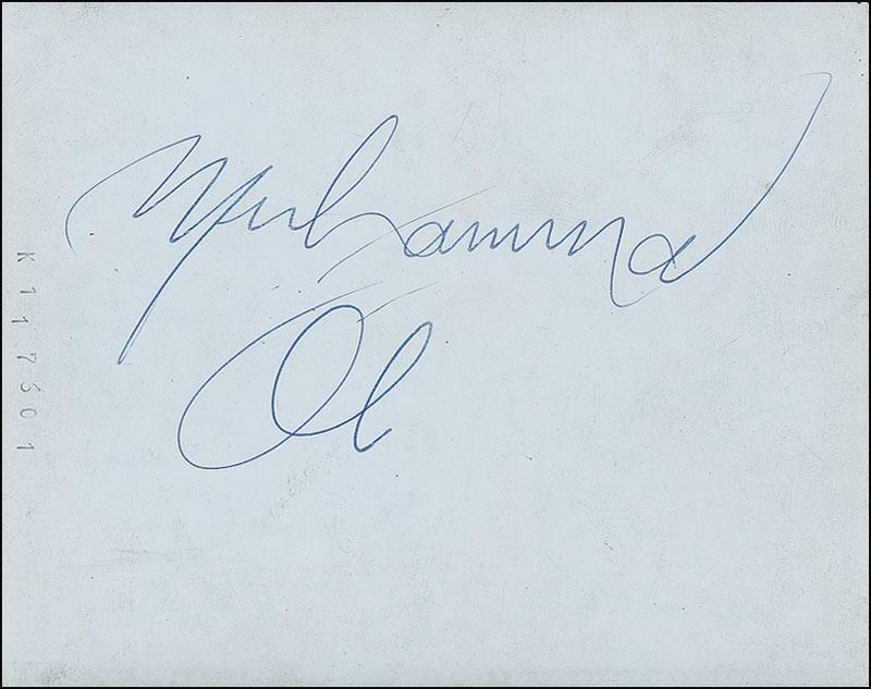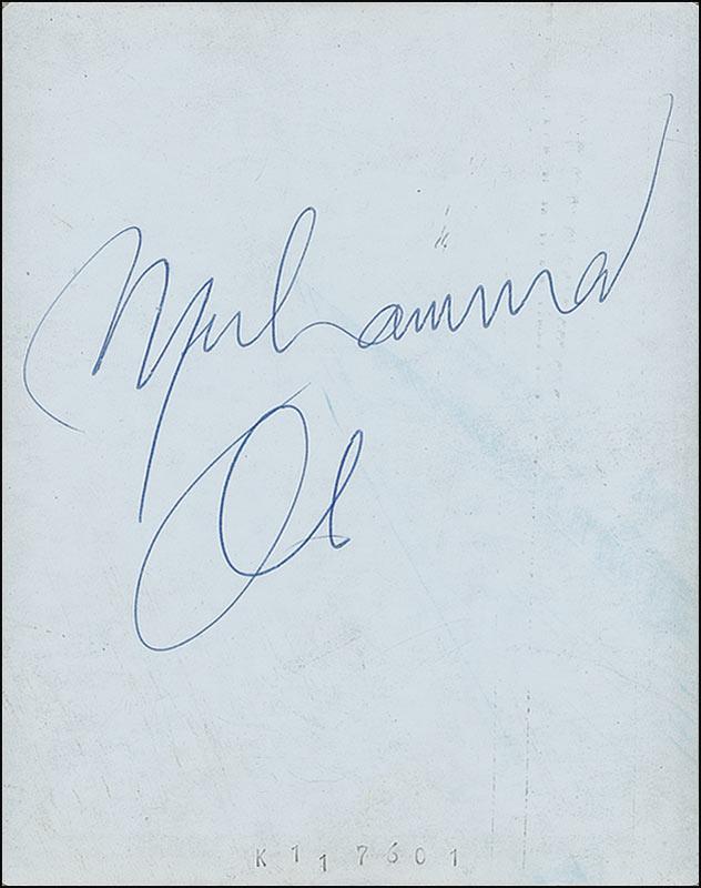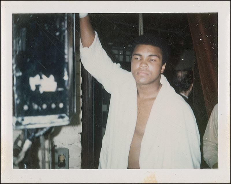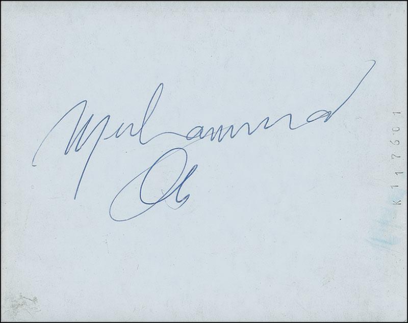 Three outstanding candid photos, each 4.25 x 3.25, each signed on the reverse in blue ballpoint, “Muhammad Ali.” According to the consignor these photos were taken on January 17, 1972, on the champ’s 30th birthday during a three-round exhibition match at Westchester Country Center in White Plains, New York. The first photo was taken as Ali headed to his dressing room, the second in his boxing robe waiting to be called out, and the third a blurry likeness of the boxer surrounded by fans. In fine condition, with the photos slightly curled, streaking to the emulsion on two photos, and surface impressions from Ali’s signature on the reverse of each. Unbelievably one-of-a-kind shots!
