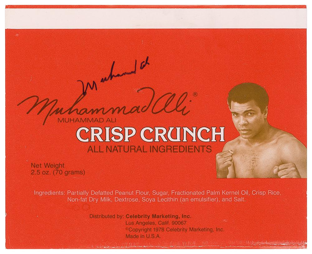 Original unused 6.25 x 5 Muhammad Ali Crisp Crunch candy bar wrapper, signed in blue felt tip, “Muhammad Ali.” Crease at the extreme bottom edge, a couple of surface marks, and show-through from two spots of soiling on the reverse, otherwise fine condition.