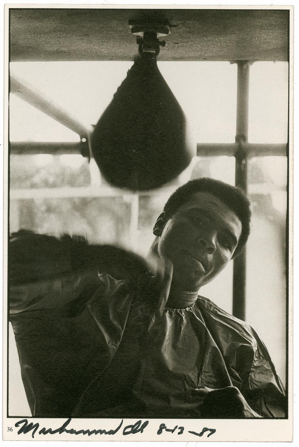 Trimmed 6.75 x 10 book photo of Ali working a speed bag, signed in the lower border in black felt tip, “Muhammad Ali 8-13-87.” Photo is affixed to an identical size card. In fine condition.