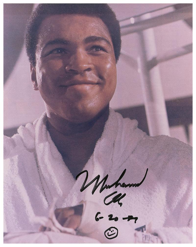 Color glossy 8 x 10 photo of the smiling champion, boldly signed in black felt tip “Muhammad Ali 6-20-89” and adding a ‘smiley face.’ In fine condition, with few small creases, a couple of small stains, and the image slightly grainy.