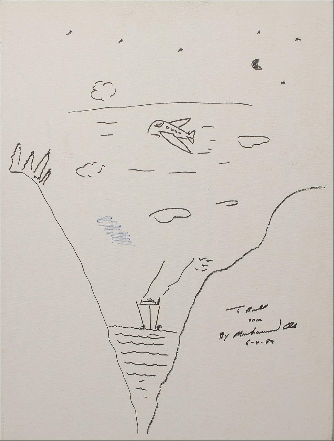 Original one-of-a-kind signed felt tip sketch of a ship at sea surrounded by birds as a jet flies by overhead, all taking place beneath the moon and stars. Ali has placed his rendering on an off-white 18 x 24 artist canvas (stretched over a wooden frame) and signed and inscribed “To Bill from By Muhammad Ali 6-4-89.” In fine condition, with scattered areas of light soiling and a few stray faint ink strokes.