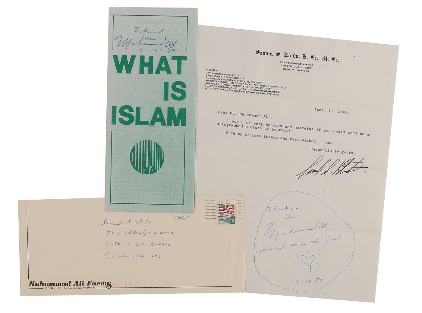 Two items: one 3.75 x 8.5, ‘What is Islam’ pamphlet, signed and inscribed on the cover in blue ballpoint, “To Samuel, from Muhammad Ali, 6-14-89”; and an AQS, one page, 8.5 x 10.75, signed in blue ballpoint, “Thank you, love, Muhammad Ali, Serve God, He is the Goal, 6-14-89,” adding a glowing heart. In fine condition, with four horizontal folds on the letter. Accompanied by original mailing letter from Muhammad Ali Farms.