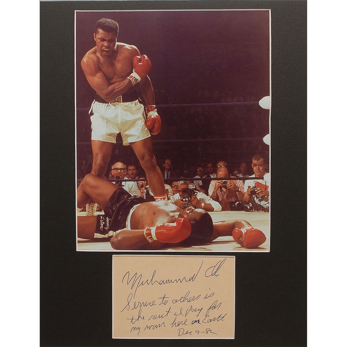 AQS on an off-white 4.75 x 3.25 off-white card. Ali writes: “Muhammad Ali, Service to others is the rent I pay for my room here on Earth. Dec 9–82.” Matted with a color glossy portrait of Ali standing over a fallen Sonny Liston to an overall size of 11 x 14. In fine condition.