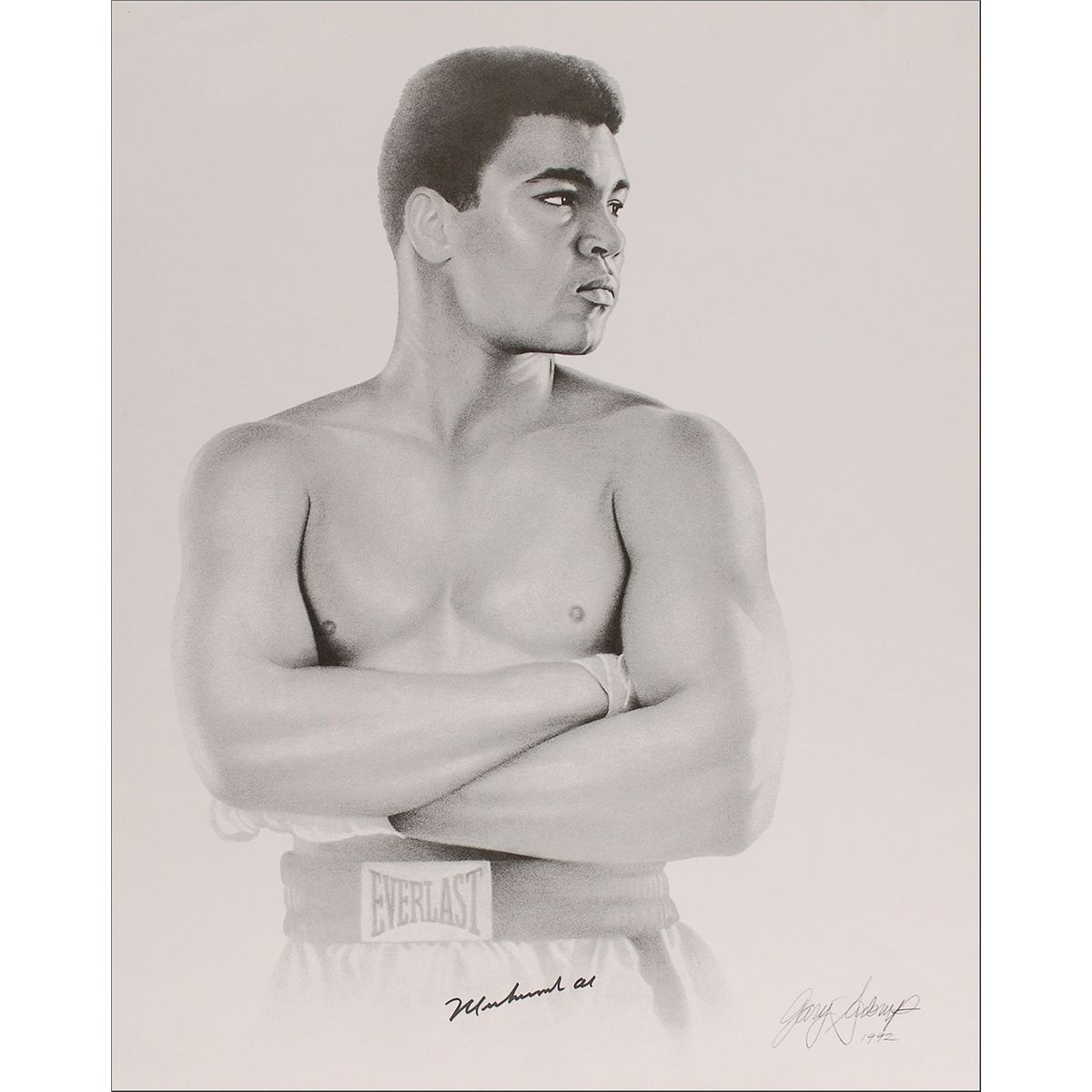 Intimidating print, 16 x 20, of a young Ali with his arms folded, signed in black felt tip.