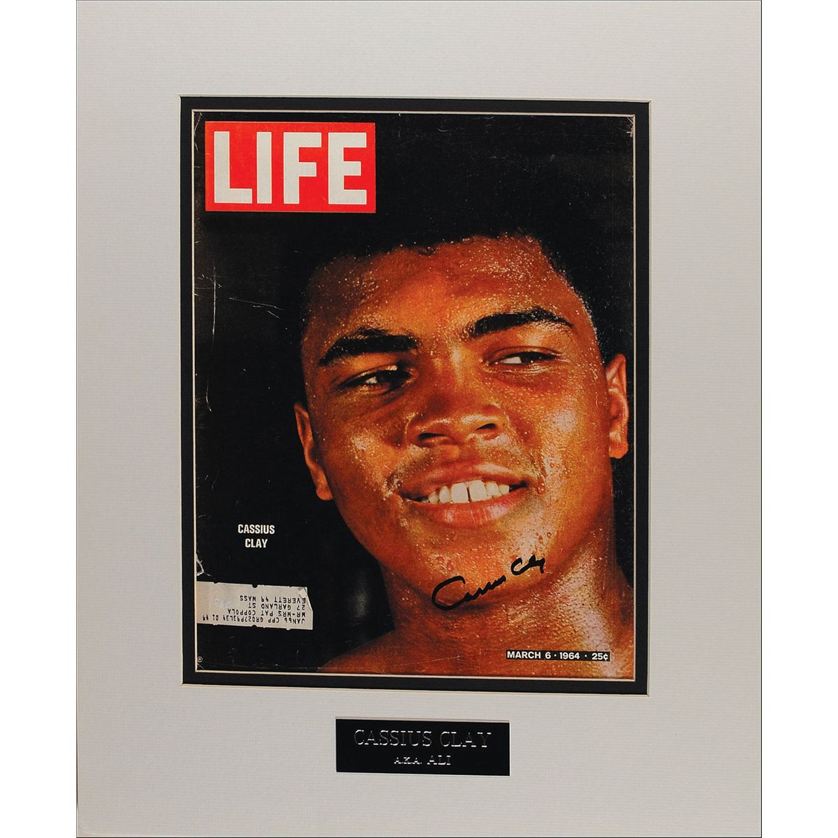 Magazine cover from the March 6, 1964, issue of Life, featuring a close-up image of a young Cassius Clay, signed in black felt tip, “Cassius Clay.” Double matted with a small plaque to an overall size of 16 x 20. Scattered creases and surface marks, and an address label to lower left, otherwise fine condition.