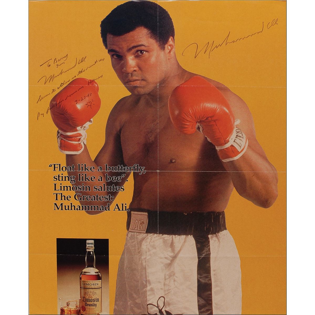 Color 15.75 x 20 promotional poster for Limosin Brandy with the printed phrase, ‘Float Like a butterfly, sting like a bee, The Limosin salutes the Greatest: Muhammad Ali,’ signed and inscribed in black felt tip, “To Barry from Muhammad Ali, Service to others is the rent we pay for our room in Heaven, 3–22–88,” adding a sketch of a radiating heart. In very good condition, with intersecting folds, surface creasing, with more pronounced creasing along the top and bottom edge, and a small tear to the top edge.
