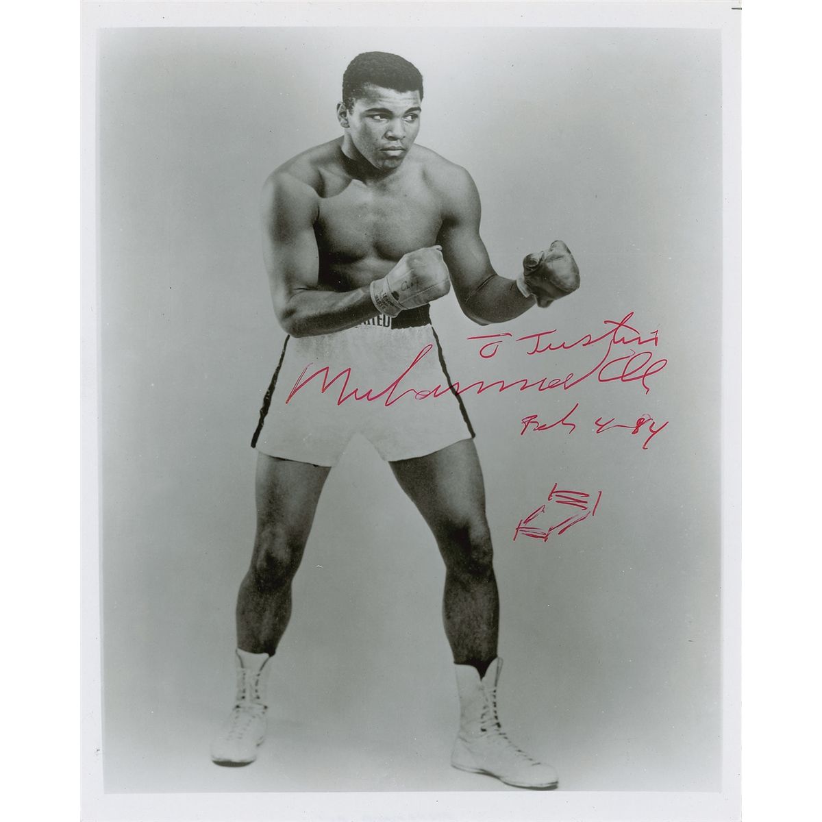 Glossy 8 x 10 photo of Ali in his prime, signed and inscribed in red felt tip “To Justin, Muhammad Ali, Feb 4—84,” adding a small sketch of a boxing ring under his signature. In fine condition.