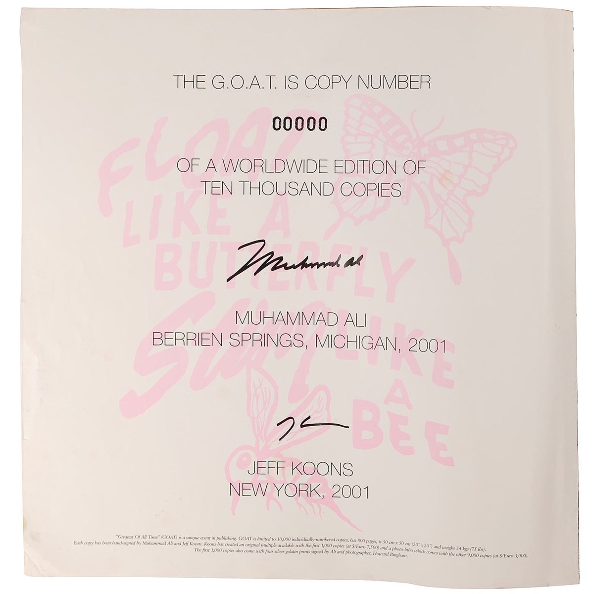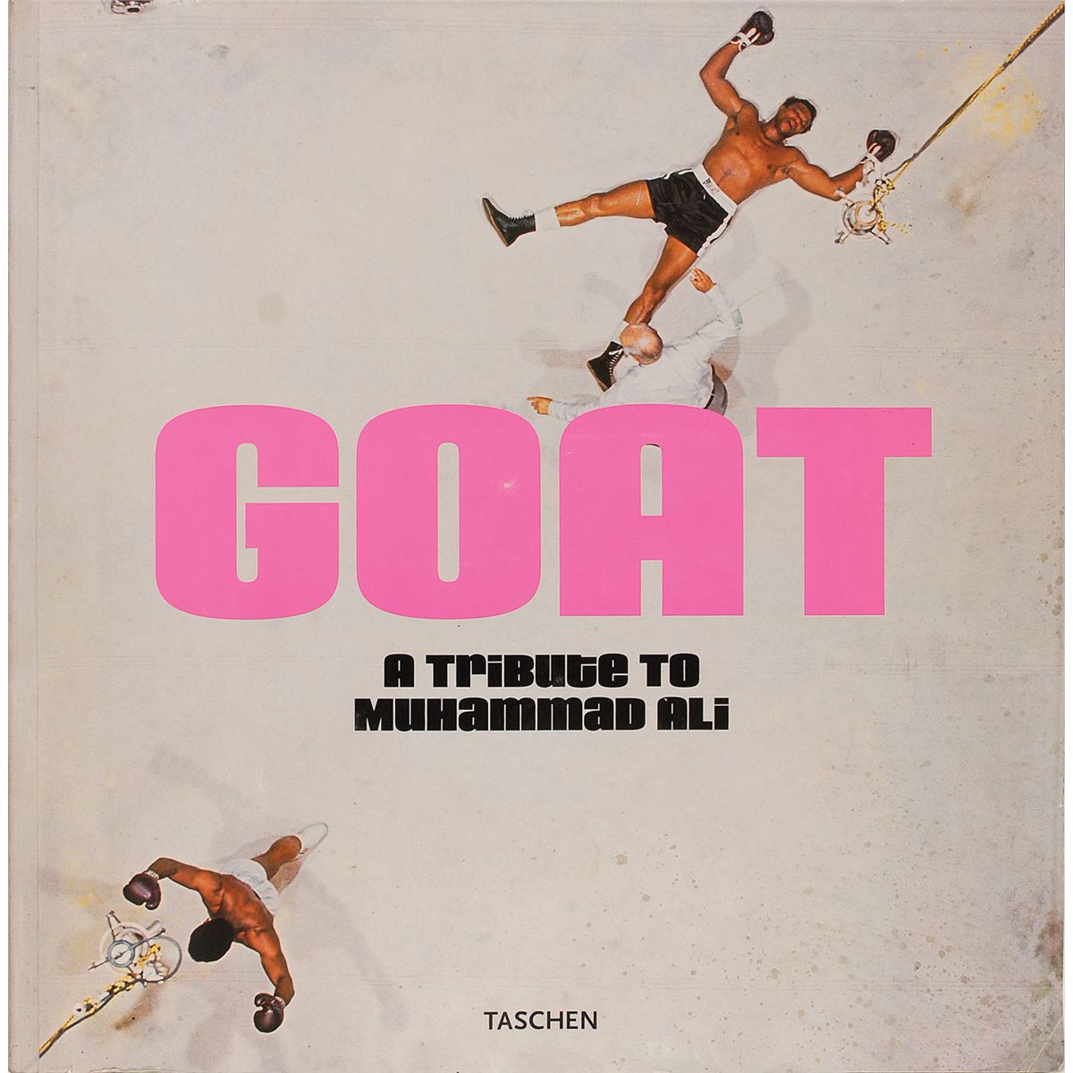 Signed book: GOAT: A Tribute to Muhammad Ali. Limited edition of 10,000 (This being No. 00000): Taschen, 2001. Softcover, 19.5 x 19.5, 58 pages. Signed on the inside front cover in black felt tip. Missing pages, old tape repair to binding, scattered spotting and edge wear to front cover, as well as light creasing, otherwise very good condition.