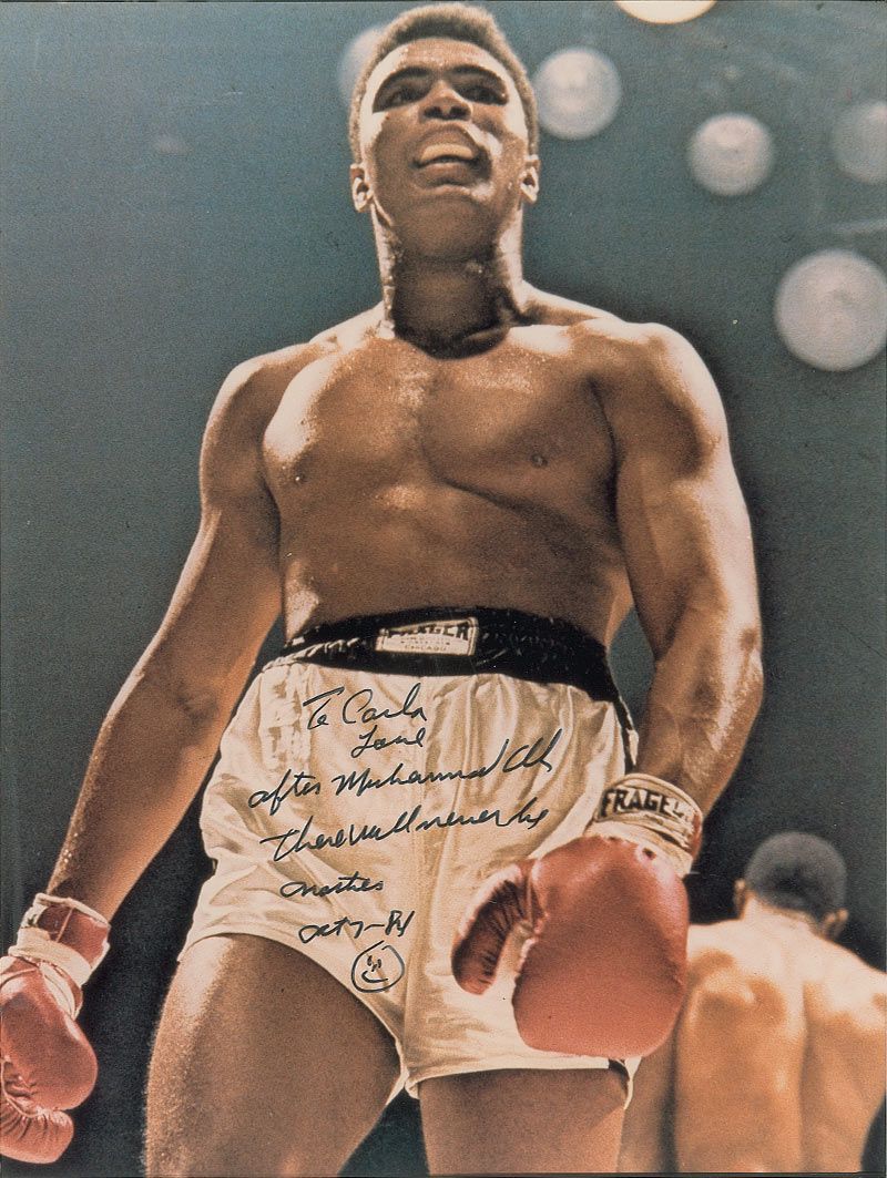 Satin-finish 7.5 x 10 photo, signed and inscribed in black felt tip “To Carla Lane after Muhammad Ali there will never be another. Oct. 7-84,” adding a small smiley face underneath. In fine condition, with a light paperclip impression to top edge.