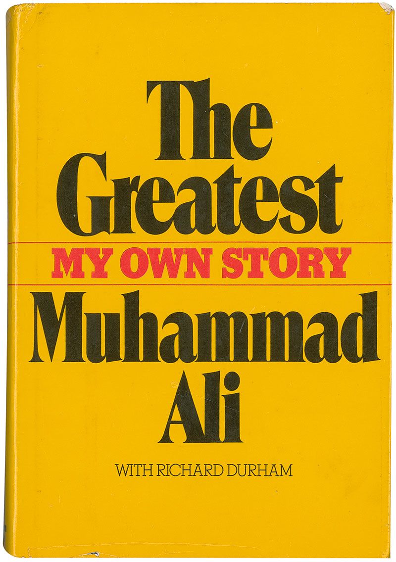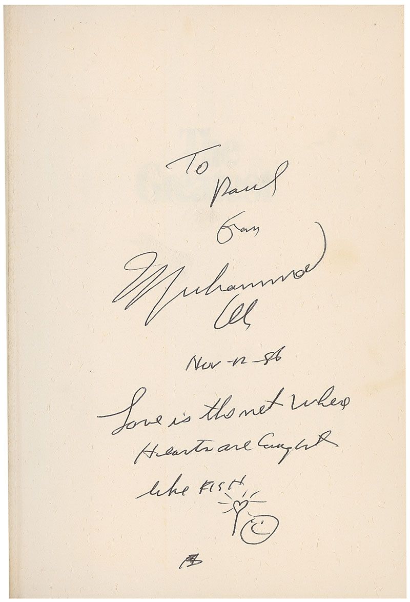 Signed book: The Greatest. First edition, later printing. NY: Random House, 1975. Hardcover with dustjacket, 6.5 x 9.5, 415 pages. Signed and inscribed on the first free-end page, “To Paul from Muhammad Ali, Nov 12-86. Love is the net where hearts are caught like fish,” adding a small sketch underneath. In fine condition, with a bit of trivial toning to signed page, and scattered light wear and creasing to dustjacket.