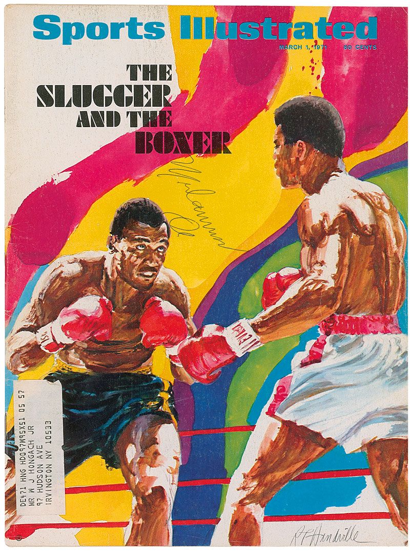 Sports Illustrated, dated March 1, 1971, featuring an artist’s image of Ali battling Joe Frazier, signed on the cover in black ballpoint by Ali. In fine condition, with some light foxing to edges of cover and a mailing label affixed to lower left.