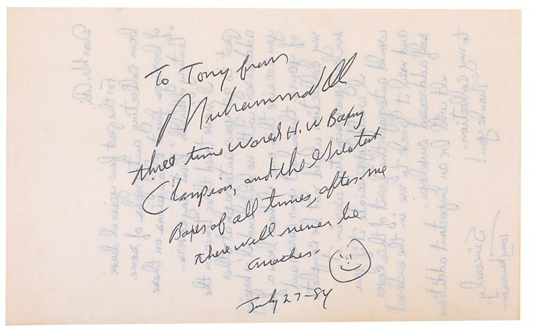 AQS on the reverse of a collector’s letter to Ali, 8 x 5, with Ali writing, “To Tony from Muhammad Ali, three time World H. W. boxing Champion, and the greatest boxer of all time, after me there will never be another, July 27-84.” In fine condition, with two vertical mailing folds passing through his signature and text, some mild toning, and light show-through from text on opposing sides.